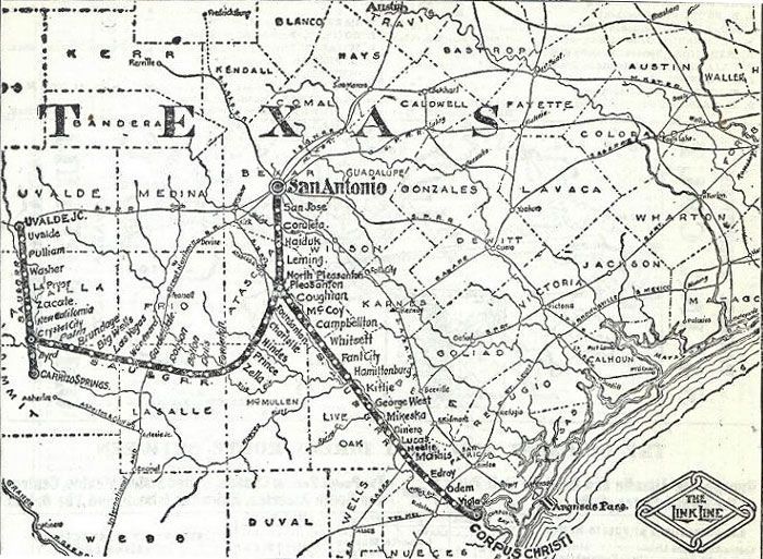 It was at this point that the nature of the whole company was transformed. The tracks turned sharply to the north east after Fowlerton, heading for Pleasanton. The CC & U had always vaguely hoped to head towards a port on the gulf but with no real plan. Instead, at least in the short term, the railroad went in the opposite direction. The reason for this was a merger with yet another railroad, the Mexico, San Antonio & Gulf (M, SA & G) that was only in the planning stages but had secured a right of way between San Antonio and Corpus Christi . The M, SA & G was created to satisfy a call made by city leaders in both large cities who were very unhappy with the service being provided by the Southern Pacific, and wanted a company to build an alternative line. Thus it was that the CC & U merged with the M, SA & G to become, briefly the San Antonio, Rio Grande & Gulf, (SA, RG & G) before changing name again to become the San Antonio Uvalde and Gulf (SAU & G). The new line between San Antonio and Corpus Christi would link with the CC & U in Pleasanton. The backers of the planned Mexico, San Antonio & Gulf were given a share in the new SAU & G in return for the right of way they had acquired between San Antonio and Corpus Christi. On its peculiar way to Pleasanton from Fowlerton, the new SAU & G went through Charlotte and then one mile north of the new town of Jourdanton, where it intersected with yet another new railroad, the Artesian Belt, built just a few years earlier. A one mile spur was built into Jourdanton, and a depot. For a while the town had two depots, but the spur was removed in 1920. For some time, even before both lines were acquired by the Missouri Pacific, both companies had the same agent in Jourdanton. Pleasanton was reached in 1912.