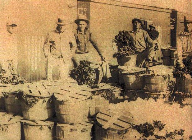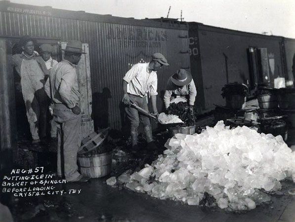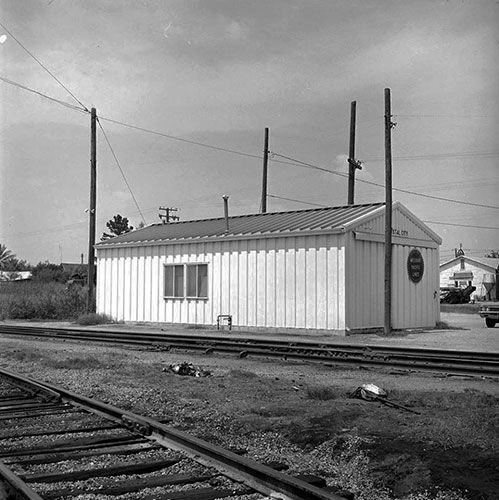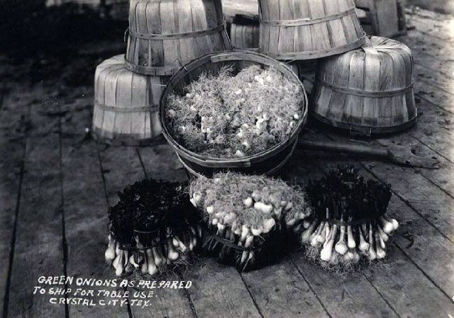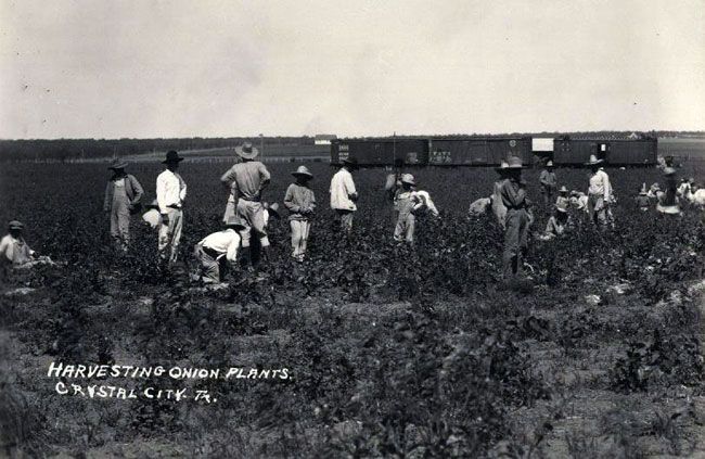 Crystal City onion field with freight cars and railroad produce loading dock