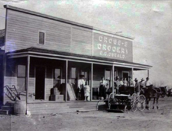 Crystal City grocery store, land office, drugstore plus last locomotive and current static caboose