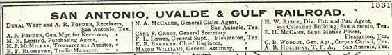 But costs had been high, and even with bonus money to help finance the railroad, the company called in the receivers on 8/14/1914. Prior to this, SAU & G VP and GM Ponder had been obliged to visit with the San Antonio Chamber of Commerce about still getting their bonus of $50,000 for completing the line to Corpus Christi by 2/2/1914, a deadline the company missed by 26 days. As Ponder later became the head of the SA CoC, it is quite likely he was successful. Other problems beset the SAU & G. Drought had both hindered construction and hurt farmers badly, and rail business immediately failed to meet expectations. The already decades old campaign to obtain federal funding to create a deep water port in Corpus Christi would not be successful for another twelve years, so shipping was very limited. When it did rain, the land would become boggy and damage to the tracks from flooding became a constant expense. With the initial bubble of optimism burst, the S.A.U. & G. was obliged to declare bankruptcy in August of 1914. It is one thing to build a railroad and buy locomotives and rolling stock. (During the companies independent existence it only ever bought one new locomotive, from Lima. Most of the time it bought used engines, or traded them with other companies.) It is quite another to run a profitable enterprise and repay your creditors. This fate befell many a railroad and it is why so many promising starts soon came crashing down to earth. It also lead to railroad consolidation, as economies of scale allowed larger organizations to operate marginal lines with greater efficiency. In 1917 the SAU & G was bought outright for only $1 million from its main creditor bank by another group of business men with A.R. Ponder, who had stayed with the company as general manager during the bankruptcy, acting as principle owner. This was because Texas law then obliged all railroads operating within Texas to be owned and operated within the state. It would appear that the bulk of the funding came from a successful Missouri oil business man by the name of John T. Milliken. This is not to say that Ponder, who now lived in the wealthy enclave of Alamo Heights did not invest himself. He believed passionately in the SAU & G and used every opportunity, including becoming the head of the San Antonio Chamber of Commerce and being involved with any number of other civic organizations to promote it.