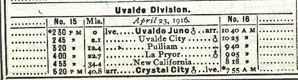 The San Antonio, Uvalde & Gulf began in 1909 as the Crystal City & Uvalde Railroad Company. The line ran almost exactly 41 miles, north to south, between Uvalde and Carrizo Springs. The original plan was only to reach Crystal City but the folks at Carrizo Springs were so concerned about the future of their town that they offered a substantial bonus to get the railroad to continue south to their city. The railroad was created to serve the new town of Crystal City, which is located in one of the most fertile agricultural areas of Texas, best known for its winter fruits and vegetables. The area's developers were hand in glove with the railroad. Carrizo Springs predates both Crystal City and the railroad by several decades. Its citizens knew that not being served by a railroad when one was nearby was often fatal to many an established town in those days. It also faced rising competition from the new town of Asherton which was created by a developer who was building his own line, the Asherton & Gulf. Carrizo Spring's status as county seat was in jeopardy. The CC & U was happy to oblige, as it doubled the potential for freight and passengers. At Uvalde, the new railroad's starting point, the CC& U snaked through the town to the main Southern Pacific line, running east to west, from San Antonio to El Paso. The creation of the CC & U line meant that farmers and ranchers, both new and established, in the newly served area could reach much larger markets for their produce and cattle.