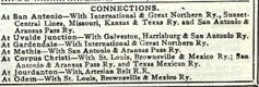 Like every other US railroad, the S.A.U. & G. was taken over by the federal government on 1/1/1918. Railroads were considered to be failing the war effort for WW I. It was returned to the receiver in February of 1920. On 12/1/1925, the "Sausage" was purchased by the New Orleans Texas & Mexico Railroad, acting on behalf on the Missouri Pacific and lost its independence. It became part of the Missouri Pacific's "Gulf Coast Lines," one of its three Texas companies. Under Texas law, any railroad operating in Texas had to be owned and run by a Texas Company. It was also around this time that the Missouri Pacific took full ownership of the International & Great Northern, also via the N.O.T & M. And, although the S.A.U. & G. used the I. & G.N. depot in San Antonio and its line into the city, both operations remained separate. The main purpose of the I. & G.N. was service to Laredo and Mexico from the north. The S.A.U. & G. served Corpus Christi, so it was natural for it to be part of the "Gulf Coast Lines".