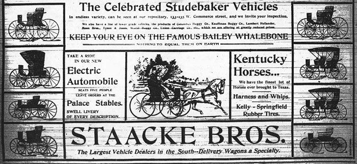 1st horseless carriages, battery powered Studebakers, arrive at the Staacke Bros. showroom on Commerce Street.