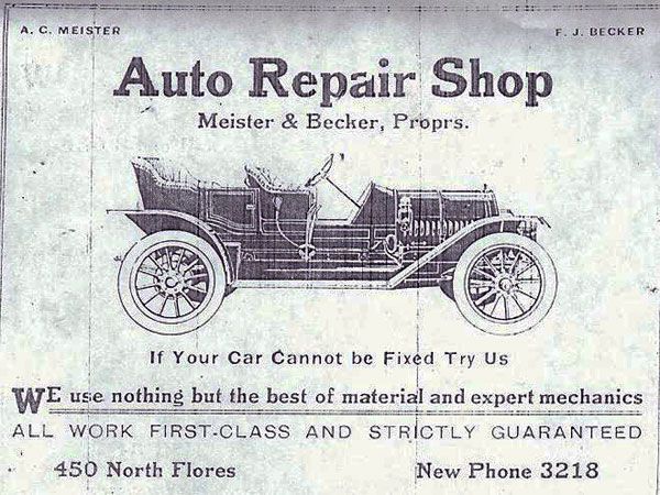 Researching early San Antonio automobile history is not easy. The usual resources, such as city newspapers and directories, are incomplete, contradictory and unreliable. As a result most of the few historians who even bothered, simply skimmed the readily available records and concluded, incorrectly, that San Antonio was very slow to adopt the automobile. More thorough research has now revealed just the opposite. Although the first automobile adverts appeared in 1902, they then disappeared until 1909 when one for an American Underslung racing type, was run on September 1, 1909. From virtually no entries in the city directory in previous years, there was a “sudden” rush of new automobile related businesses in the 1910 edition. From just two names in 1909, the list grew to nineteen the following year. By 1911 this had grown to fifty-seven. This years also saw the first time an automobile related advert in the city directory, for Meister & Becker’s repair shop at 450 N. Flores.