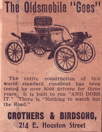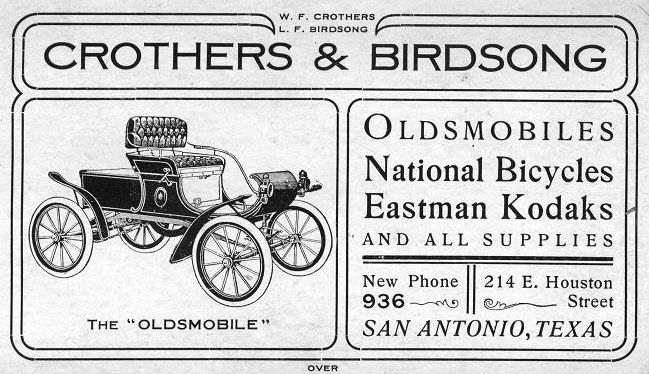On September 16, 1902 the pair sold the vehicle, to a Mr. G.E. Vaughan. Established as the city’s first automobile agency, they soon sold more “Merrie Oldsmobiles” to several more customers including Fred Cook who was elected to the position of president of San Antonio’s first automobile club in the fall of 1903. In 1904 Birdsong and a companion, Welcome Smith, toured Texas in a Curved Dash, just the kind of publicity stunt beloved by Oldsmobile. They camped where necessary and often were the first horseless carriage in many communities