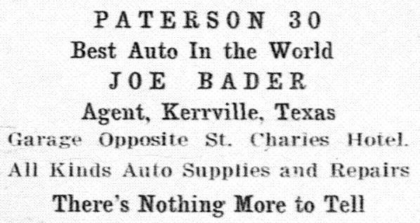 Cars were still prohibitively expensive for most people. The Maxwell sold for $1,400.00 and the more modest Ford Model C cost $650.00. Even so, when it became state law in 1907 for all cars to be registered with the county of residence, some 20,000.00 were to be found in Texas. Recognizing the market for lower priced vehicles, several people in the area, such as Joseph Bader in Comfort, set up a small shops to rebuild worn out cars into drivable vehicles using a mix and match approach, including some new items but mainly refurbishing parts otherwise headed for the scrap heap due to age, obsolescence or accidents, of which there were a great many. Bader’s operation was so successful he moved to a larger location in Kerrville but the introduction of the low priced Ford Model T and the Brush soon reduced demand. He stayed in business perforing automotive repairs, however, for many years.