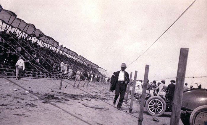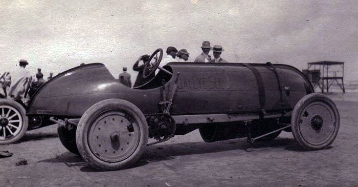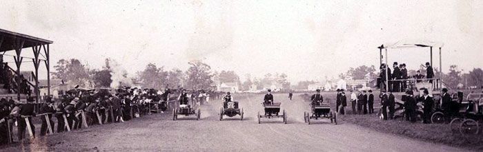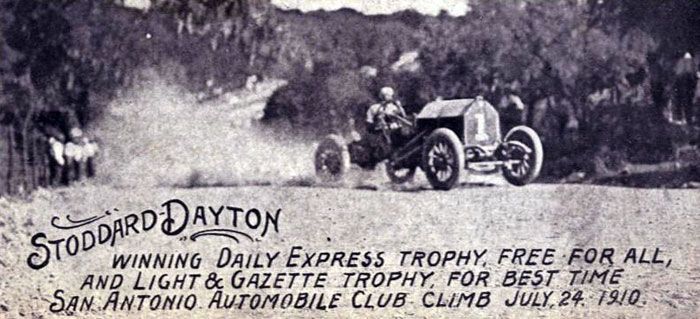 1902 saw the arrival of at least two more horseless carriages. In January a steam powered Locomobile appeared and Louis Heurmann became the make’s sales agent in the city. The vehicle was described as “gliding noiselessly under complete control.” And in the summer bicycle shop owners Lewis Birdsong and Frank Crothers acquired one of the first mass produced vehicles in the world, the single cylinder Curved Dash Oldsmobile, which sold for $650.00. It was delivered in a crate to their residence on Marshall Street by a horse drawn wagon straight from the railroad. Although neither man had ever seen a car they made their living repairing racing bicycles plus, like many young men enthralled with the spirit of the age, they had been studying automotive developments in magazines such as the American machinist and the Scientific American which ran an article on the gasoline powered three-wheeler built by Karl Benz in 1885. In no time they had it assembled and running, though exactly where they acquired gasoline is a good question. Quickly becoming familiar with its simple controls driving it backwards and forwards within the confines of their yard they took it out onto the street. The Curved Dash Oldsmobile was not a complex machine to operate. It had two forward gears and reverse. It rode on twenty-eight inch wheels with wooden spokes and pneumatic tires. Its brakes operated on both the differential and the rear wheels. Before long the young men grew restless sedately puttering at twelve miles an hour along local streets including South Alamo, one of the few paved streets at that time so they headed to the race track at the International Fairgrounds where they had so often ridden their bicycles to glory. (See chapter on bicycles for details.) Here they were able to scud along the bumpy tracks, used mainly for horse racing, at the unheard of speed of 30 MPH.