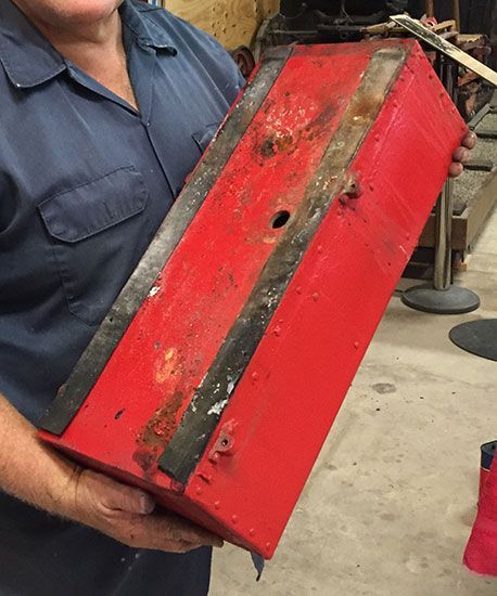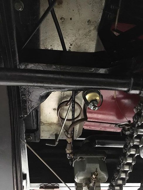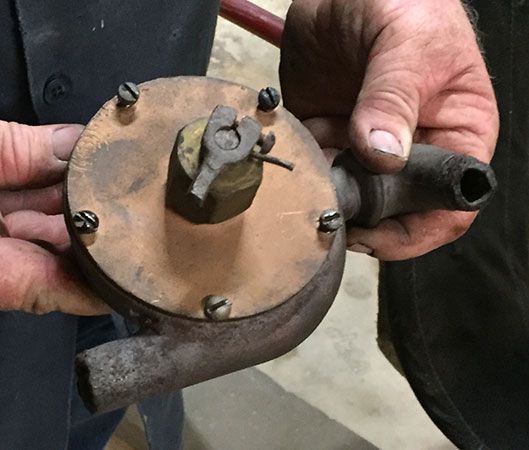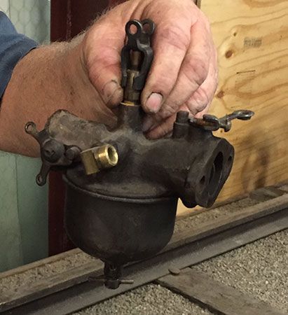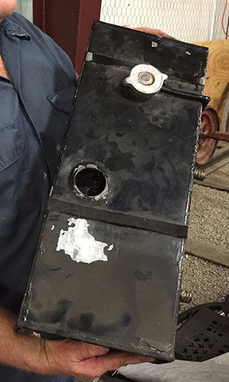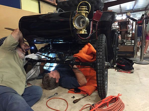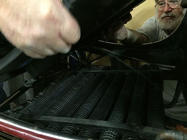 In late December 2015, museum members began preliminary work to find out how easy it might be to get this wonderful and historic vehicle to run again. Removing the radiator water and gas tanks was relatively easy. Both were found to hold a significant amount of residual debris from the fluids last used in them. The water pump will need to be rebuilt. The car has been retrofitted with a Ford Model T carburetor, so finding a rebuild kit for it will be child's play. The toughest part of the project was figuring out how to remove the flat radiator located under the floor boards. A whole bunch of other items, such as rods that connect the brake and gas pedals, had to be removed first, but they were safely extracted.