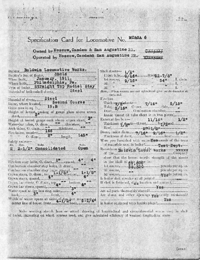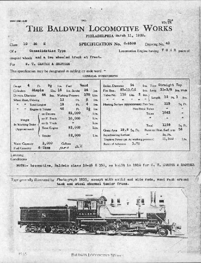 Presented here are just two of the many original Baldwin Locomotive Company documents the museum acquired along with the locomotives in 1971. It seems that the locomotive was returned to Baldwin around 1929, to be converted from being wood fired to oil fired. The documents state #6 was built in January 1911 for the company. More documents in our bulging files are from the Interstate Commerce Commission in Washington D.C. requesting updates on the locomotive for their files since the originals, filed in 1911 were missing. In addition, all subsequent work, modifications and repairs were voluminously documented. The engine was relatively trouble free, according to the inspection reports.