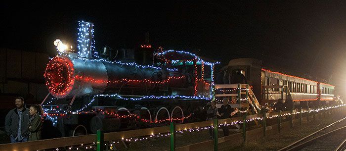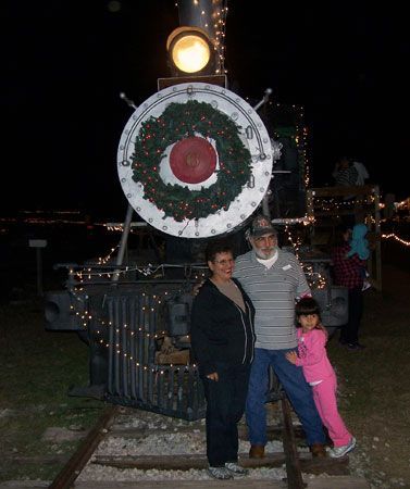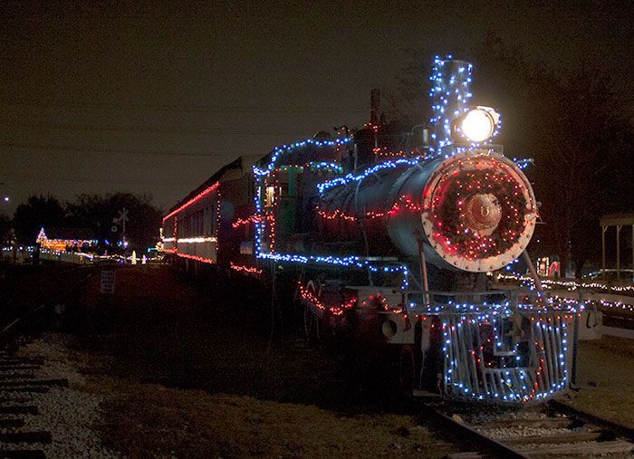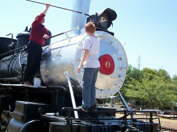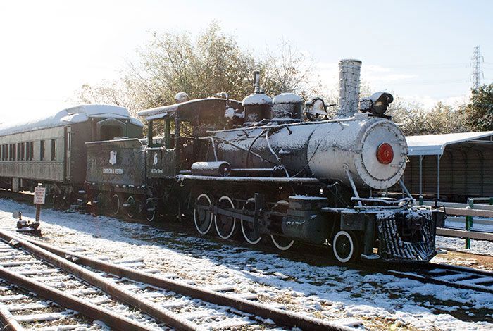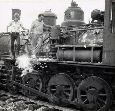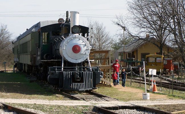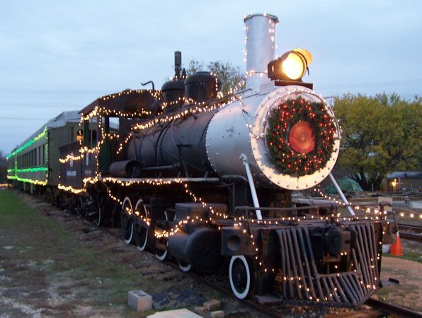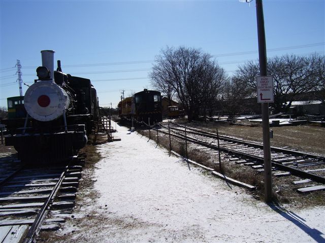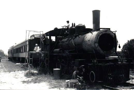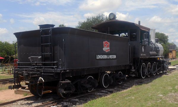 During it's time in Georgetown it was featured in a movie. It was "dressed up" as the M.K. & T. 736, for its role. To enable it to produce smoke while it was moving, tires were burned in the fire box. The smoke was expelled through the stack due to normal convection as the wheels turned, producing a most realistic effect. A hidden diesel at the rear of the train provided the real motivation. No one at the museum seems to know what the movie was called. It was probably a forgettable western. As it was retired in 1956, some of the images included here may be stills from the film, judging by at least one car in the background and the higher quality of the pictures. #6 was immediately returned to its correct identity upon its arrival at TTM. It has been painted several times since, due to the powerful nature of the sun in Texas. It has been installed as the head piece of our static display. It also is a very prominent feature of our Christmas Extravaganza.