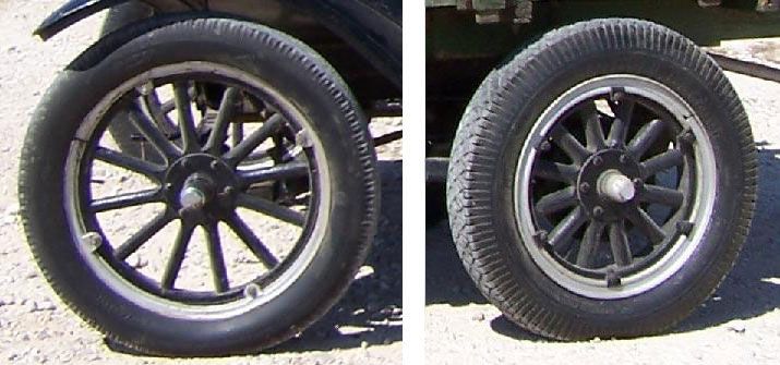 Another distinguishing feature of the TT is its wheels. Its wheels have shorter, stouter spokes and a wider rim to accommodate stronger tires than the high, narrow wheels on regular Model Ts. The spokes on the front wheels are slightly longer and thinner than those on the rear, which has a different, stronger inflatable tire to handle most of the weight. This was a step up from the old days when most trucks had solid rubber at the back.
