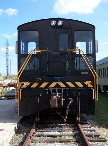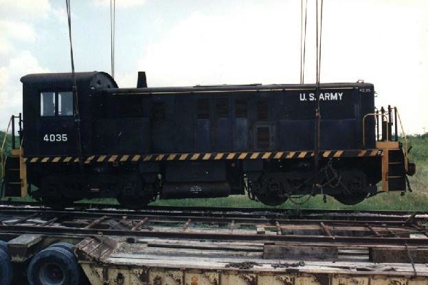 Some 74 of these locomotives were built during the Korean War. They were some of the last ever constructed by the historic Baldwin Locomotive Works, which began building steam locomotives in 1825. 44 of these 61 ton switchers were designed for foreign use and had special axles which allowed the wheels to be easily widened from the standard American gauge of 4 feet 8 1/2 inches to five feet, which just so happens to be what the Russians use. Those built for domestic use were numbered 1247-1276, those for foreign use were numbered 4001-4044. All were designed to be operated in areas with low clearances. "Foreign" units such as the 4035 are slightly longer than the domestic version at 39 feet 2.5 inches. Engine heaters were installed to allow for operation in temperatures as low as minus 40 degrees Fahrenheit. Maximum safe speed is 51 MPH, with a tractive effort of 15,650 pounds at 7 MPH. The wheels are 40 inches in diameter. It can hold 500 gallons of diesel fuel.