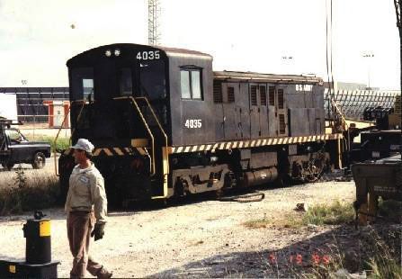 The 4035 is a 61 ton 0-4-4-0 locomotive, a RS-4-TC 1A, built by the Baldwin Locomotive Company in August of 1954. RS-4-TC stands for Road Switcher - 4th design - Transport Command. It has a 500 HP, 8 cylinder Caterpillar diesel, with a bore of 6.7 inches and a stroke of 7.5 inches, supplying electricity to four traction motors, one per axle. It was rebuilt and upgraded to have an EMD control standards, and its engine was de-tuned to match the generators. Its original wheel trucks, which could be widened or narrowed to fit other rail gauges, were also replaced.