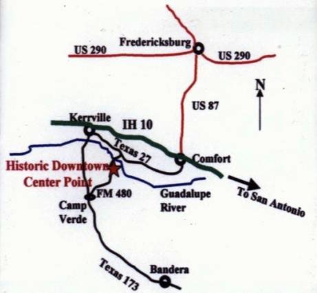 Center Point in Kerr County is located half way between Bandera and Fredericksburg, and between Comfort and Kerrville. It is on the south side of the Guadalupe River from HWY 27, the old main road to Kerrville from San Antonio. The old railroad right of way ran adjacent to the highway, on the north side. This land was owned by the de Ganahl family who provided right of way for the San Antonio & Aransas Pass in 1888. The family hoped this would spur new settlement on their property but this didn't happen until the road was improved after the railroad was pulled up in 1971.