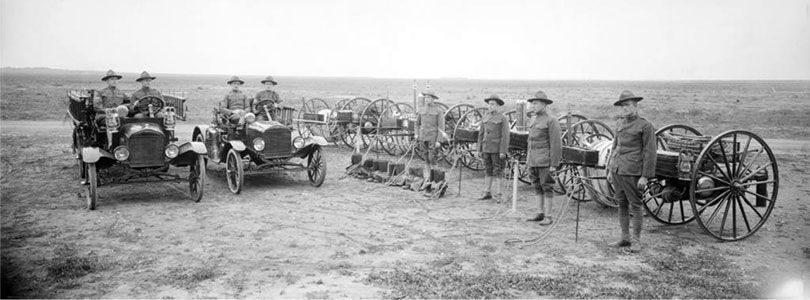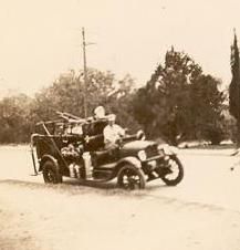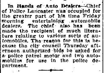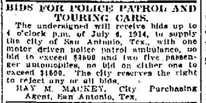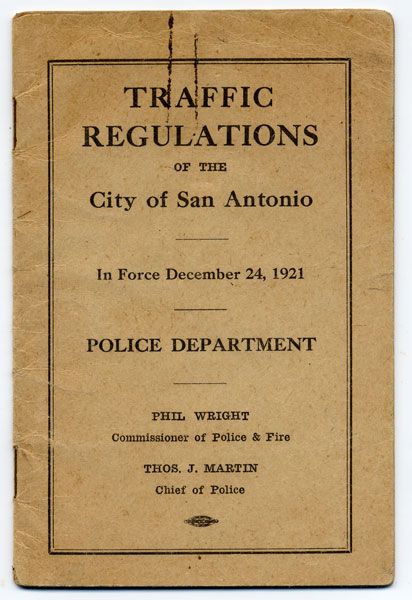 Although the city published its first set of road regulations, including the instruction that automobiles must drive on the right side of the road, in 1910, it was not until August 1915 that the San Antonio police department acquired its first department owned motorized vehicle, an air-cooled Franklin purchased from local dealer Lewis Birdsong. The department paid $2,050, $46,600 in today's money, for the Franklin intended for Police Chief Lancaster. Mr. Birdsong's own records indicate that he had sold a Franklin to the department in 1910 but this may have been a private sale. Two officers may also have used their own motorcycles for police work before the department acquired its own machines. These followed the tradition of many officers using their own horses prior to mechanization. At the same time, the department was also authorized to purchase more automobiles and motorcycles. By November 1917 these had been acquired, giving the department the use of five automobiles and eleven motorcycles. By this time the automobile and its attendant problems were commonplace in San Antonio, where the first automobile club had been formed by thirteen charter members, including Mr. Birdsong, as early as 1903. At the same time the San Antonio Light was reporting on the acquisition of vehicles for the SAPD, it reported that a local plumber, Jonathan Bowman, a 72 years old immigrant from Liverpool, England, was struck by a north bound automobile on Alamo Plaza, immediately outside the Menger Hotel. He died in the horse drawn ambulance operated by Riebe, presumably a local contractor. The automobile's driver, one Felice Rojas, was arrested. He stated that Mr. Bowman had simply stepped off the sidewalk right into his path, perhaps failing to appreciate that cars go faster than horse drawn carriages. Local papers were also talking about the problem of overly bright head lamps at this time. Even the lowly Model T introduced a resistor into it circuitry to stop its six volt headlights receiving too much power from the magneto. A proper dimmed position was introduced in 1919.