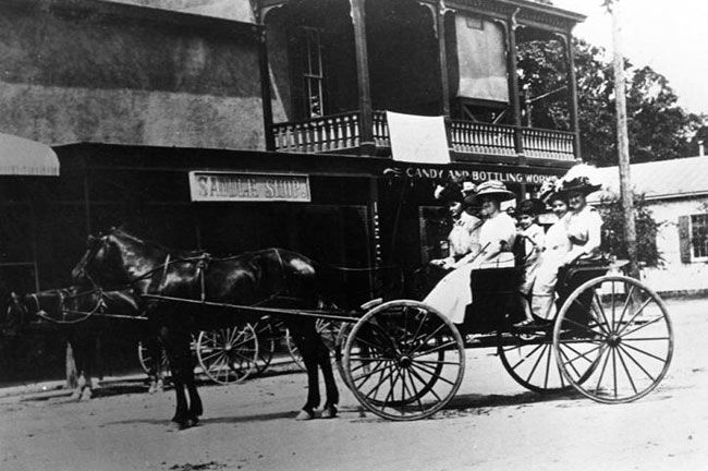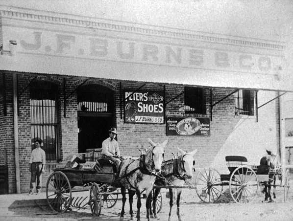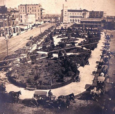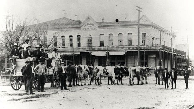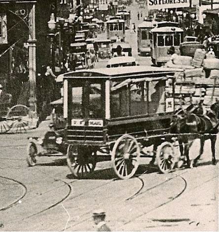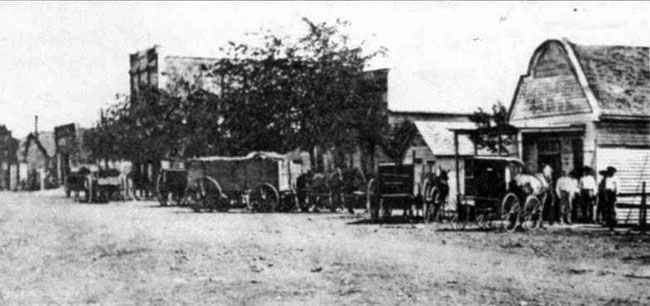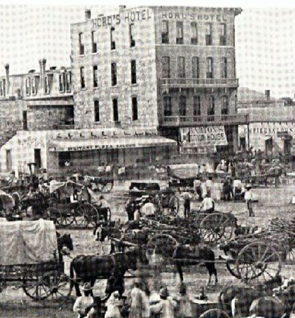 Mule drawn rail street cars begin service, including the new railroad depot which was quite a long way from the city center. Hotels acquire hospitality wagons to bring rail passengers and their luggage to their locations. Local freight is hauled to warehouses and around the city on "floats" or large flat, side-less platforms on wheels, pulled by mules.