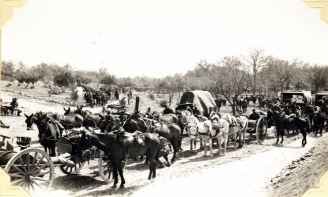 Trains usually consisted of twelve wagons, requiring a minimum of two dozen men, ten mules per wagon, plus additional mules as replacements, a wagon master and a caporal, to look after the animals. Each man would have a quality weapon. At night the train would be split into two separate corrals and sentries would be posted and charged with maintaining a keen lookout. The train always had an ambulance which was then simply the name for a wagon set up for sleeping while on the move, for those who had stood guard all night.
