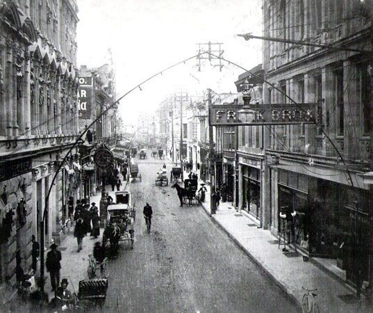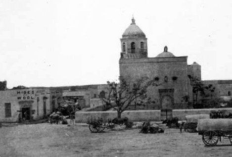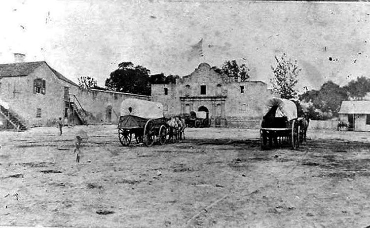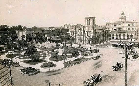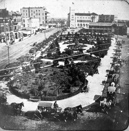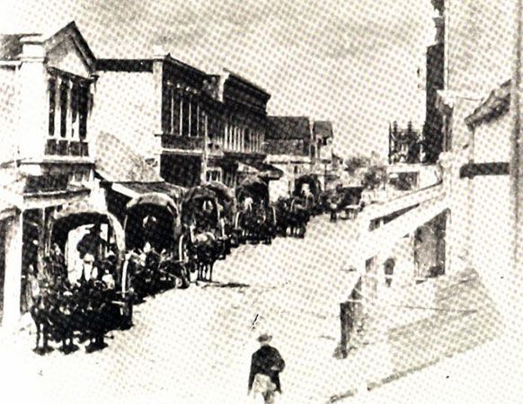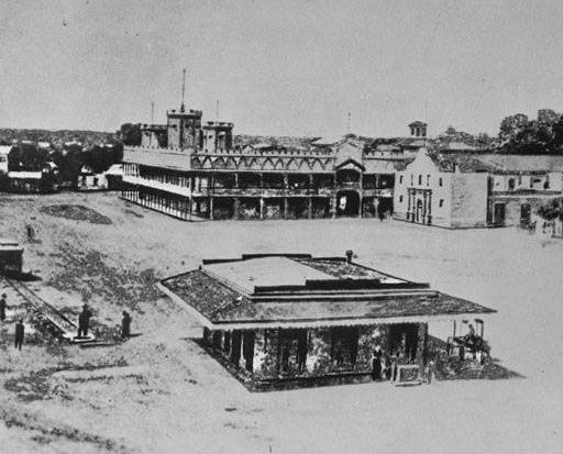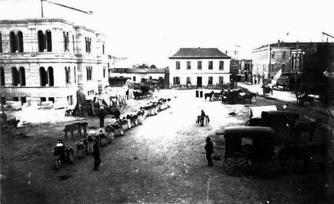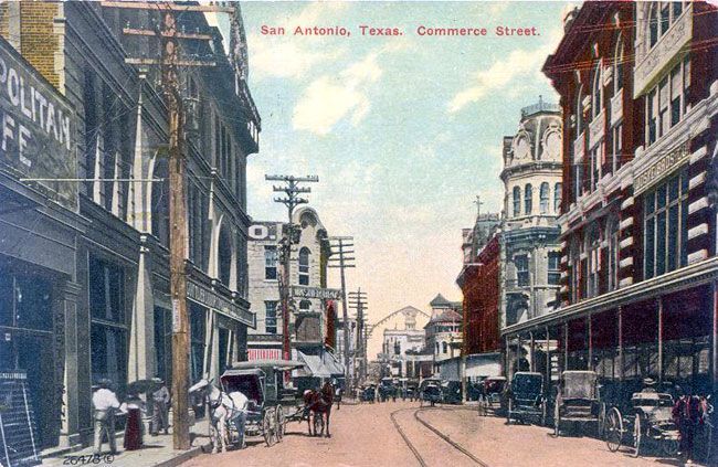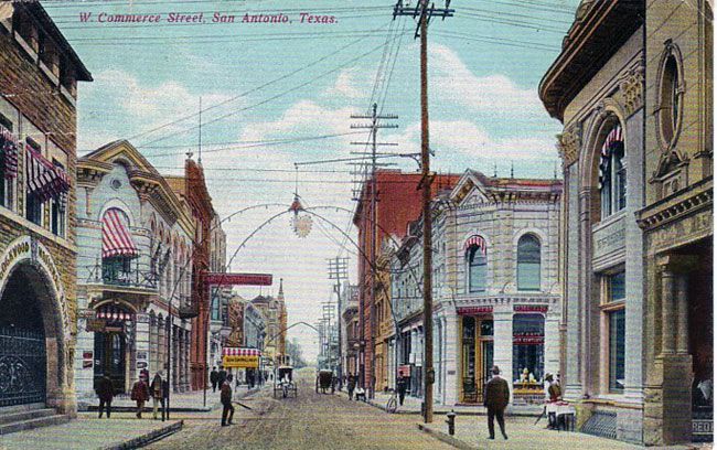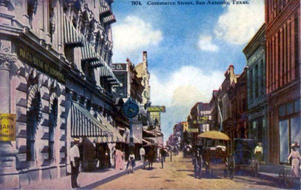 From San Antonio's very earliest days in 1718, the thoroughfare between the Alamo and San Fernando cathedral, now called Commerce Street, was the most important thoroughfare in the city. The first wooden bridge suitable for more than pedestrians and light carriages was built over the river in 1841. Replaced with a stronger wooden structure in 1867, Commerce Street was thronged with activity of all kinds. Freight trains of up to thirty wagons, each pulled by teams of oxen and mules, arrived and departed every day. Mixed into this would be street vendors and blacksmiths. The number of mules, horses and oxen must have made the air almost unbearable. Disease carrying flies filled the air. A stroll across Main Square full of grazing animals provided an entirely different experience from today.