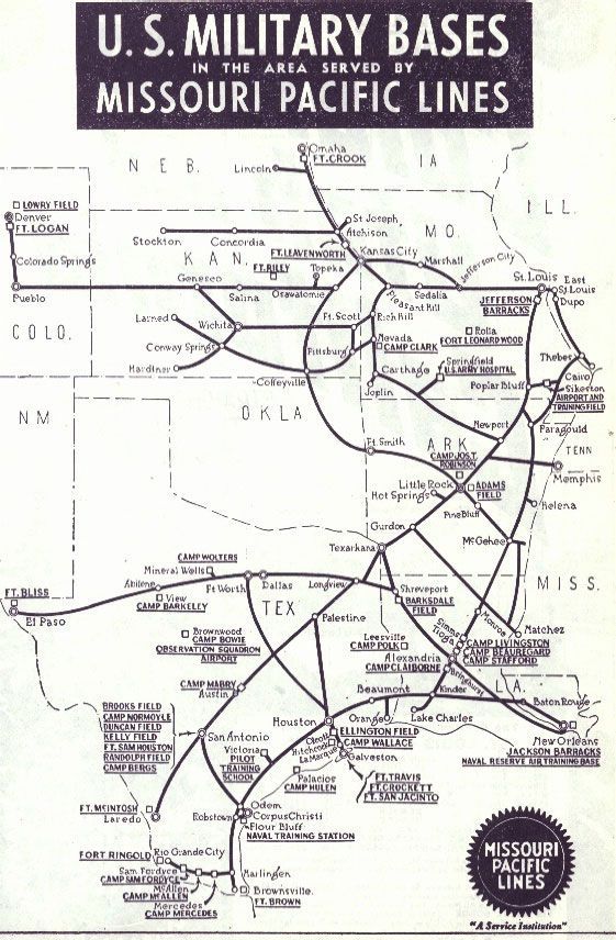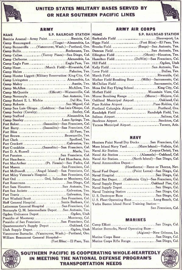 The growth of military bases in San Antonio and the extent of the S.P. network put the city and the railroad front and center in the war effort and both rose to the challenge magnificently. San Antonio experienced explosive growth during the crisis with an influx of both military and civilian workers on a unprecedented scale. The S.P. had 290 military installations along its routes, more than any other railroad in the nation. Aircraft factories on the west coast built 60% of all aircraft during the war and 44% of all ships. Almost all movement of oil during the war was handled by the railroads as oil tanker ships were diverted to support the military overseas. In 1944 the freight tonnage being moved by the S.P. was double the previous peace time peak of 1929. As early as 1940, the army and the S.P. began joint exercises. Moving entire battalions involved as many as a dozen or more trains. An armored division needed 75 trains to move all the men and equipment. The nation's railroads as a whole moved 97% of all organized troop movements during the war and 90% of all the military's freight and express requirements. The number of bases in San Antonio and South Texas and the port facilities in Houston and Corpus Christi, saw train movements of all types rise to unprecedented levels. Due to the careful preparations and improvements, the system was able to cope with all of the demands placed upon it.
