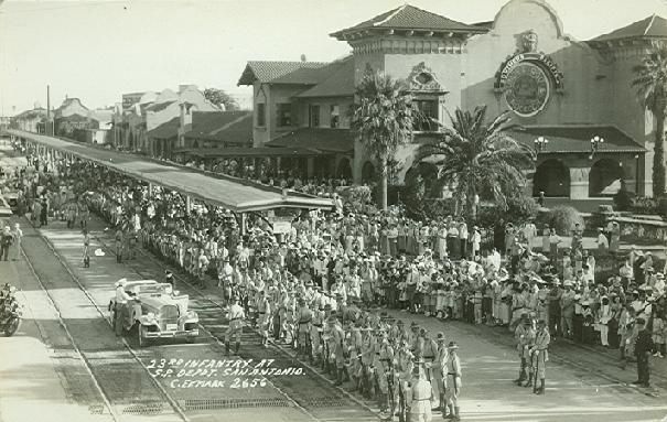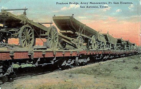 Fort Sam Houston was established very close to the first large freight yard built in San Antonio. Named East Yard it, like the army base, is still in operation today only now a major interstate, IH 35, is located between the two. A spur line was built right into the camp from the yard. These tracks were not removed until the early 1990s and a rail bridge over the freeway at the current main entrance to FSH is still in place. Through many wars these tracks provided ready access to the rail system to the army. San Antonio became a military city. No other city in Texas, certainly not Dallas, Fort Worth, Houston or Austin comes anywhere close to the number of facilities created here.