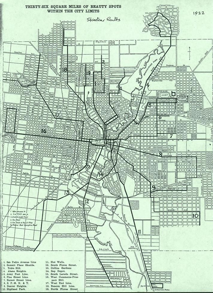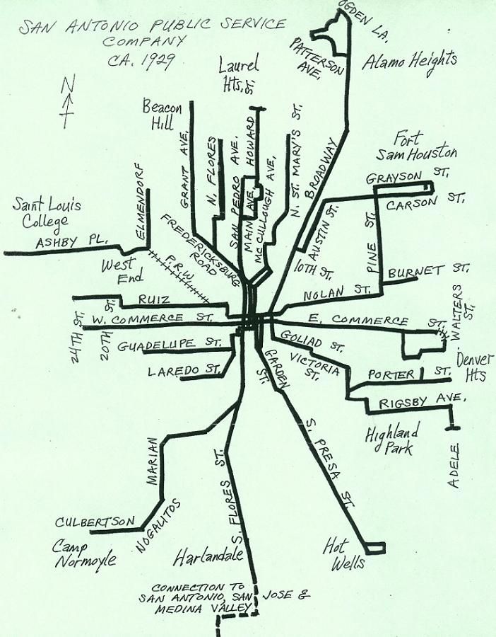 This map representing the San Antonio streetcar and bus system in 1924 was made on behalf of the City Water Board, which itself was created in 1924. (It eveolved into SAWS in 1992.) Using a 1924 map and information supplied by TTM founding member John Kight, the map shows not only the streetcars but also the bus routes as well.