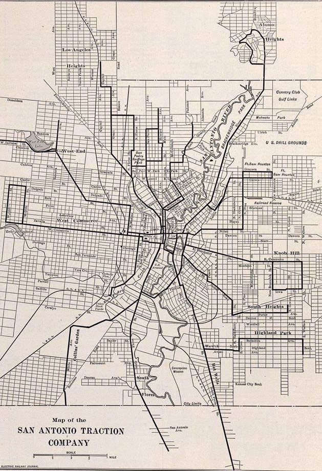 The streetcar network which had already evolved from one company per line radiating from the city center to four larger companies is consolidated into just one organization, the San Antonio Traction Company.