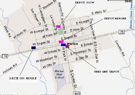 Marion is a small town located on HWY 78 approximately half way between San Antonio and Seguin. It has around 1,200 residents and a fine set of schools set in a nicely connected campus. The railroad still runs right through the middle of town, just the way it was planned by Thomas Peirce way back in 1876. Peirce was the owner and developer of the Galveston, Harrisburg and San Antonio Railway. This line would eventually stretch right across Texas, from Galveston to El Paso, bringing modern communications and prosperity right along with it. Marion is unusual in that the town was actually laid out by Peirce himself. He designed the town so that there would be eighteen blocks on each side of the tracks, laid out in three rows of six. As an inducement to settlers, he reserved two blocks; one for the first male one for the first female born in the new town. A question remains after whom the town is named. Was it named for Peirce's own daughter or the daughter of the Dove family? The Doves were the owners of the cotton plantation through which the rails had been built. The answer is, "Yes."