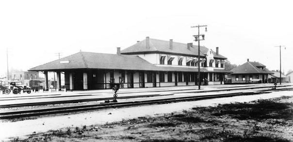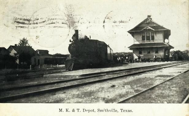 Highly stylized image of the Missouri, Kansas and Texas railroad station in