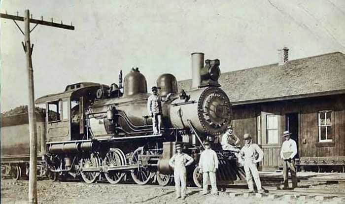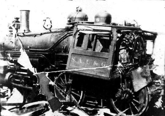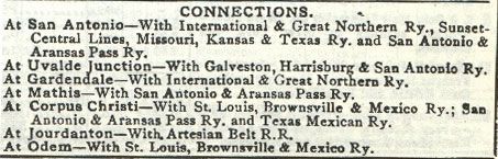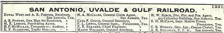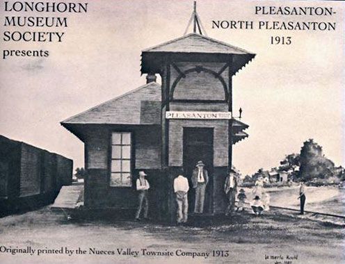 The tracks between San Antonio and Corpus Christ are completed. The company changes its name to the San Antonio, Uvalde and Gulf (SAU&G). Its HQ is moved from Uvalde to Pleasanton. A new two story station is built in a new town called North Pleasanton, with maintenance shops, etc. A more humble wooden depot is built in "old" Pleasanton, less than a mile away.