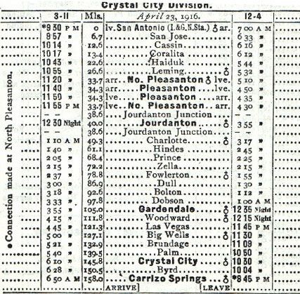 The new line's revenue was desperately limited. When more money from colonizers was offered, it was decided in 1912 to make more additions to the line. Today, colonizers would be called land speculators. They bought up large ranches and sub-divided them, for sale at public auction. To make the lots more attractive, towns would be platted out as well, and very often a lot within the yet un-built towns would be thrown in with a purchase of a larger farm. Railroad service was vital to the success of these auctions, not to mention the viability of the farms and towns to be created. There were no roads in the area worth speaking of and no tax base within these poor counties to build any. Some of these communities were given very optimistic names, like Las Vegas. Of the many names you will see on the 1916 map, between Crystal City and Pleasanton few still exist today. Despite some interest by Belgian immigrants, Las Vegas lost its post office in 1917 and had only one occupant in 1940. Today it is completely gone.