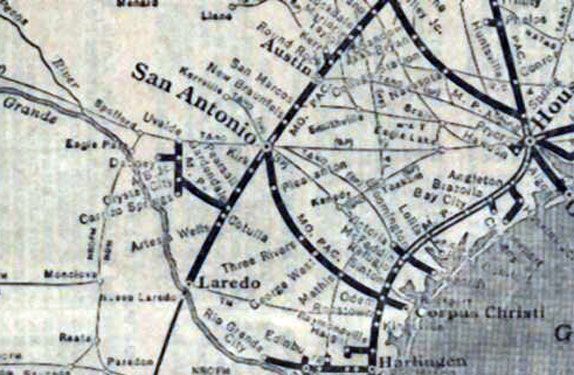 This changed rapidly after 1956 and everything became, simply, Missouri Pacific. With the improvements in the road system and the emergence of larger and larger trucks, many of the smaller lines became less and less viable. In 1959, the tracks from Pleasanton to Gardendale were pulled up. The "Sausage intersected the main MOPAC line to Laredo at Gardendale, which, in 1931, had a school with 50 students. It is little more than a ghost town today. The old "Sausage" was no more. What remains today is the line from San Antonio to Corpus Christi. An attempt was made by a new company bearing an old name, Crystal City Railroad, to keep the western leg open, from Uvalde to Carrizo Springs, and Crystal City to Gardendale. The C.C. R.R. was operated as an independent short line from 1990 to 1992. but went out of business in 1992. The tracks themselves were removed ten years later.