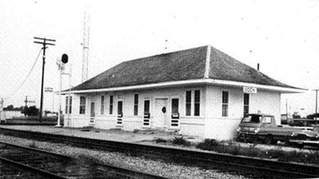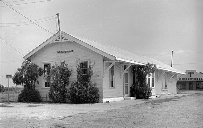 First and second Carrizo Springs railroad depots, a map showing depot location and abandoned railroad right of way today