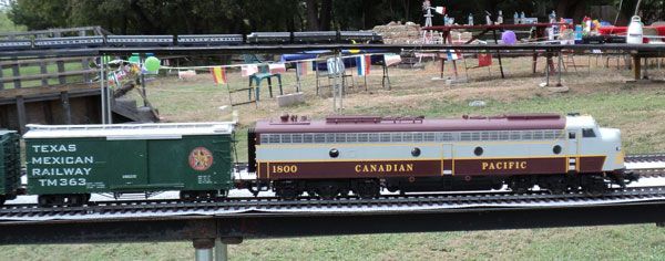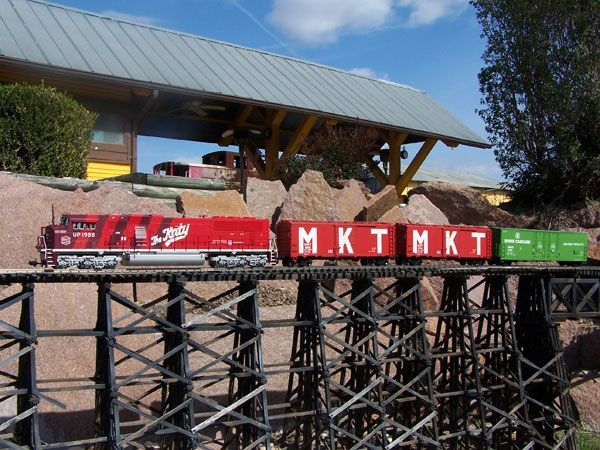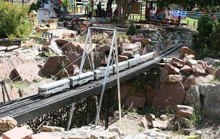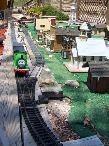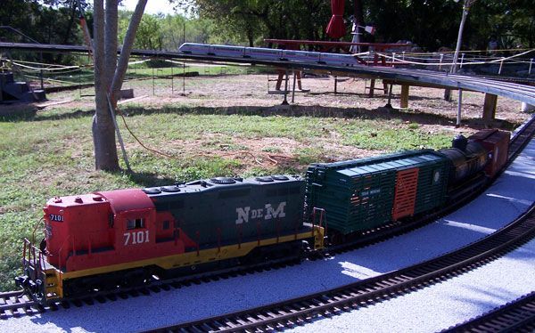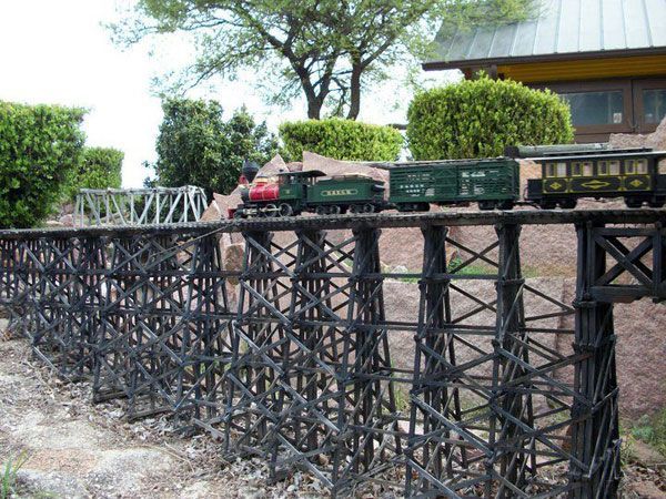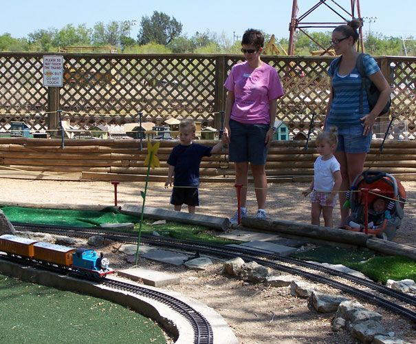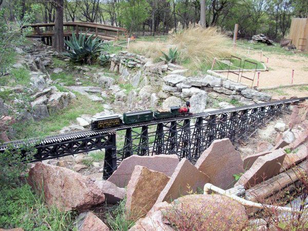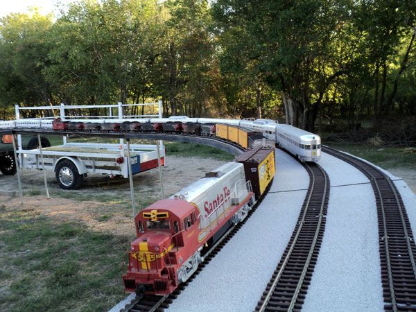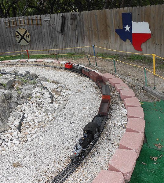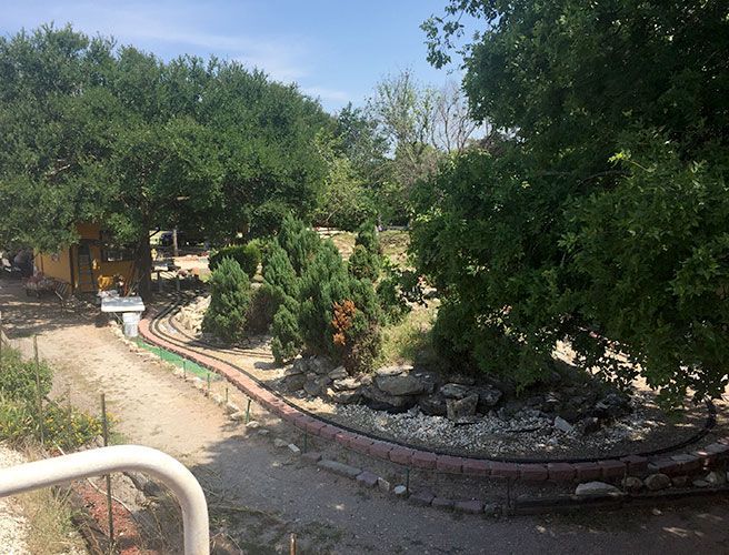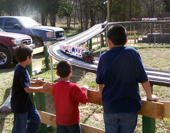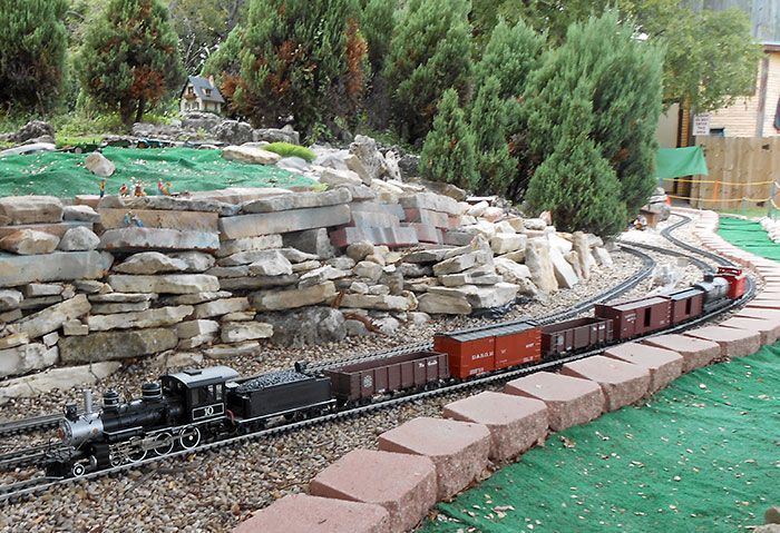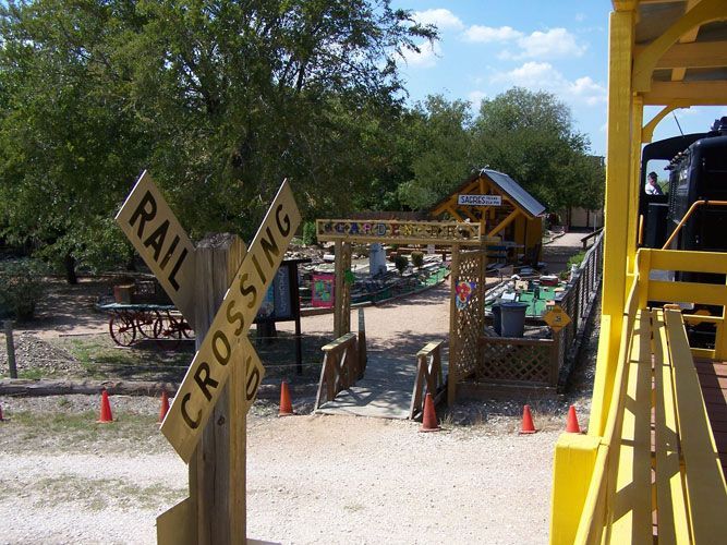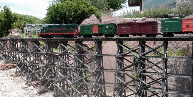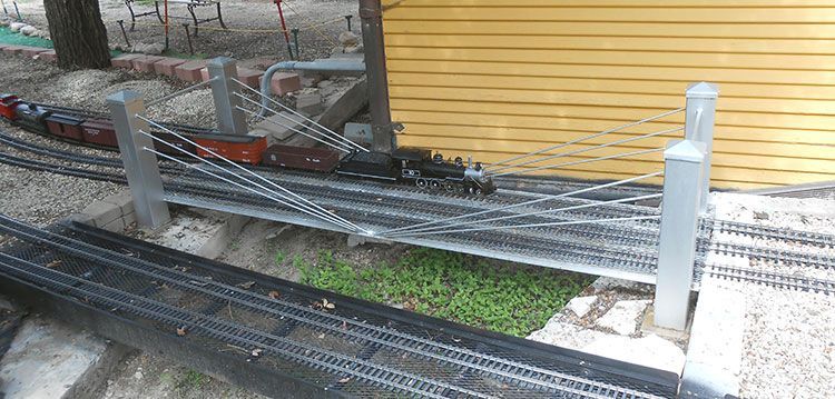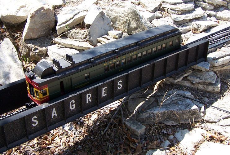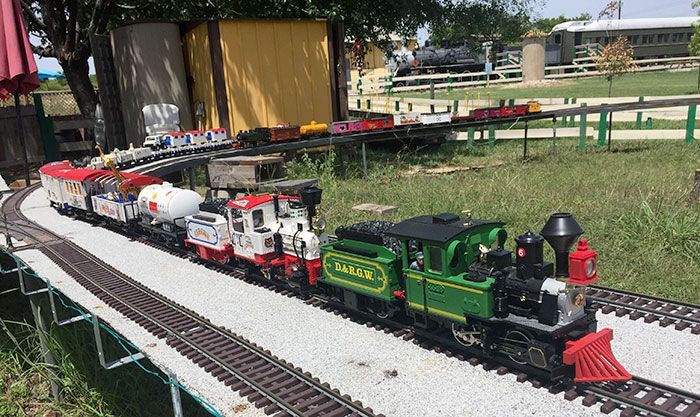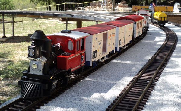 Frequent museum visitors know that the "G" gauge garden railroad at the Texas Transportation Museum is one of the most delightful places at the museum. It is operated by the "San Antonio Garden Railroad Engineers Society" or SAGRES. "G" gauge, or large scale outdoor model railroading, is the fastest growing area in the world of railroad enthusiasts. SAGRES operates the largest outdoor "G" gauge complex in the state of Texas. They currently run trains on no less than seven active loops at their popular site which occupies over an acre. They have two loops, plus multiple sidings, on the original layout on the ground. There are two small loops at child height at the "Island of Sodor" which was purposely built for the benefit of younger children. It is here they will find "Thomas The Tank Engine" trains such as Percy and all the rest, including, of course, Thomas himself. The latest addition to their operations is a large elevated set of tracks. This was installed and wired up in 2011. A lot more work needs to be done to make it look more attractive but that just comes with the garden railroad territory.
