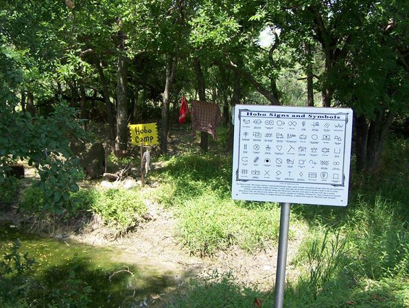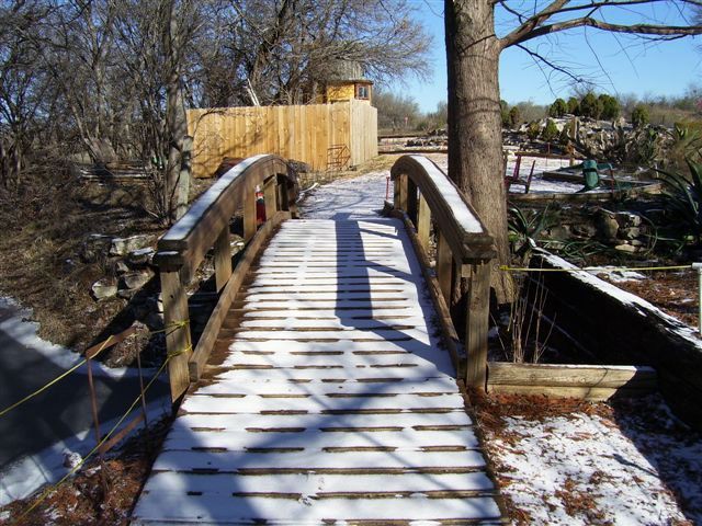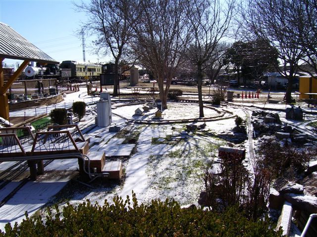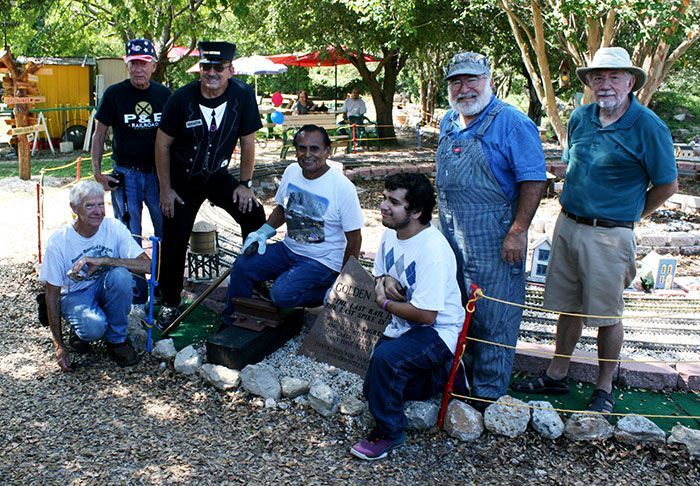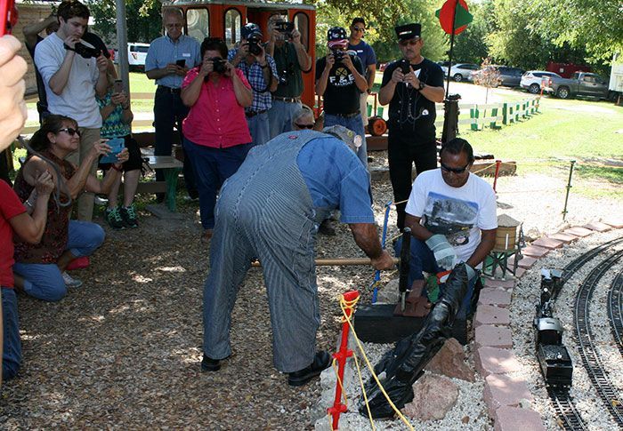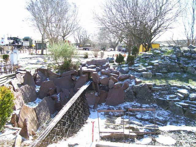 This ceremony marked the end of a two year project to completely refurbish the original "G" gauge ground layout at the Texas Transportation Museum by SAGRES (San Antonio Garden Railroad Engineer Society) members. The rebuilding project added a total of 448 feet to the old # 2&3 layout. It involved a total redesign and rebuilding of the track beds. The main lines have 7 trestles of which 6 are custom made. The crown jewel is a 20 foot trestle over the huge gorge on the far side of the layout from the yard area. The tracks now measure 1,343 feet, the equivalent of around ten miles in full scale. See dedicated section below for images of the new layout.