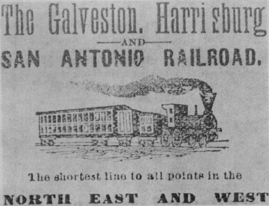 The arrival of the first steam train arrived on tracks laid by the Galveston, Harrisburg & San Antonio Railroad. It was a "smoke belching, stove-pipe model pulling a baggage car and one passenger coach, filled with officials. The train was met by a band, and it's arrival was celebrated by half the town's population, some 8000 people.