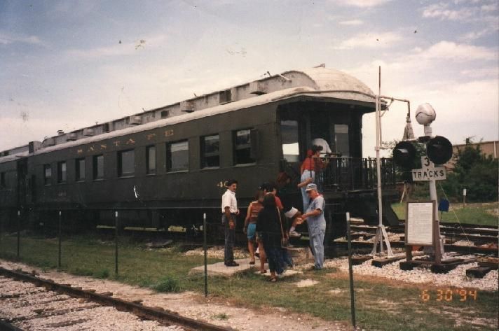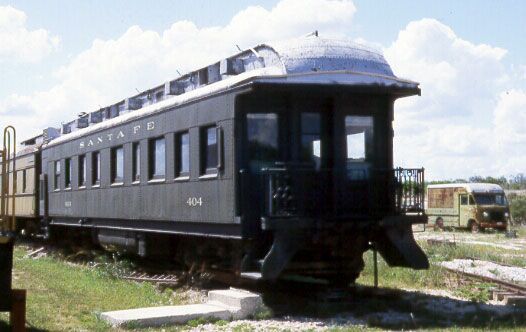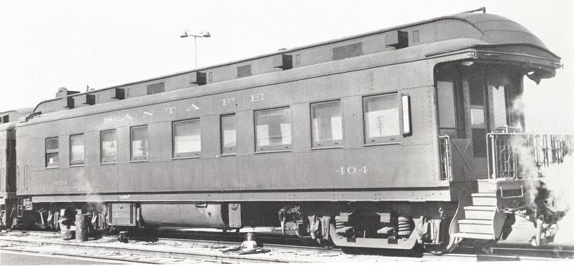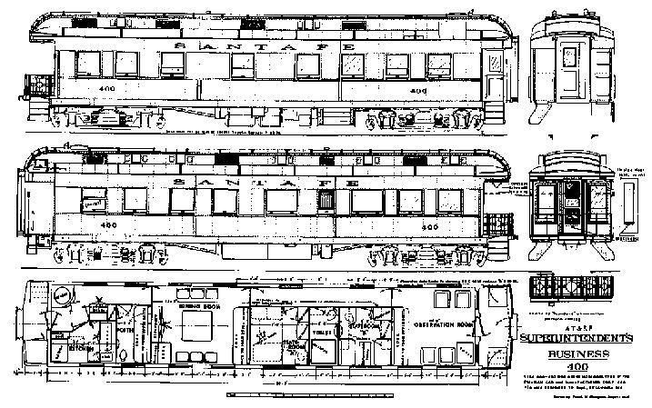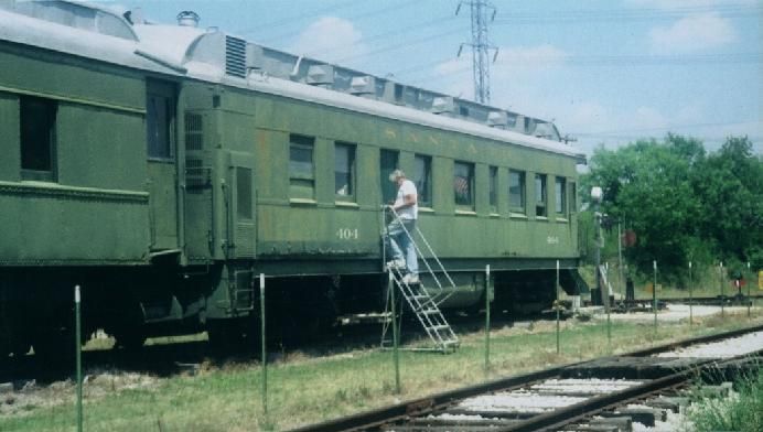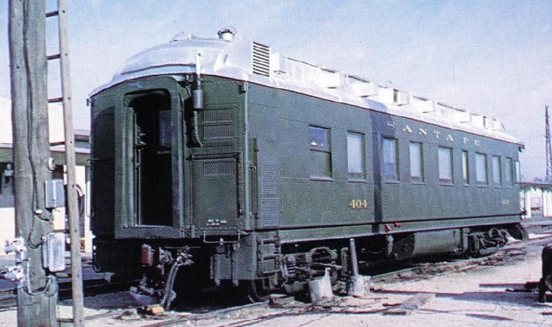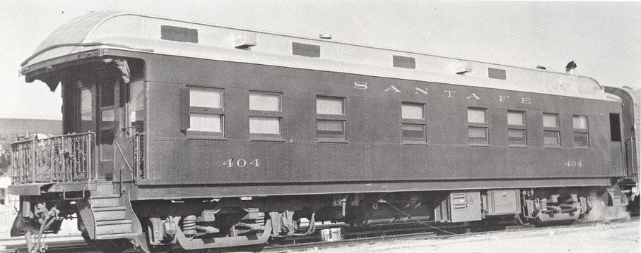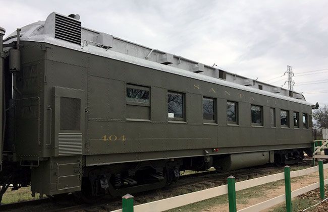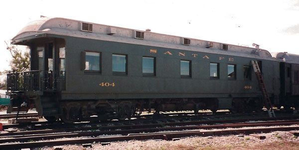 The '404' is one of the first significant pieces to be acquired by TTM.. It was donated by Neil Boldrick and arrived on August 15th, 1979. It is a 60 foot long, 50 ton, Business Car. It is one of 17 such cars built by the Pullman Company on plan 4977, and was delivered to the Atchison Topeka & Santa Fe Railroad on January 26, 1926. It was assigned to the Superintendent of AT & SF's Eastern Lines, Eastern Division whose headquarters were located in the second floor of the depot at Emporia, Kansas. The AT & SF, Atchison Topeka & Santa Fe, is now part of the BNSF, the Burlington Northern Santa Fe.