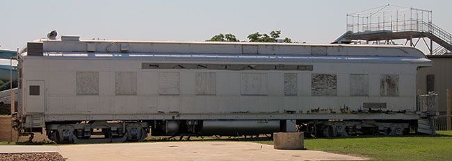 Santa Fe Business Car 401 has not been quite so lucky but even its prospects are looking up. For a long time it was privately owned and stuck in Seguin. The spur track that once served the siding was long gone, with a business located where the tracks used to run, although the rails set into the road are still there. The car was all but abandoned and was used, like so much derelict railroad equipment, by vagrants as sleeping quarters. The City of Seguin was keen to rid itself of this eye sore. The area itself has been significantly improved. It was offered to the TTM but we were obliged to decline, as we did not have the money to move or restore it. The fantastic news is that it has been saved and can now be found at the ZDT Amusement Park in Seguin. The snap below was taken in 2010. Its appearance may have been significantly improved since then. Our understanding it is to be used as a party room of some kind.