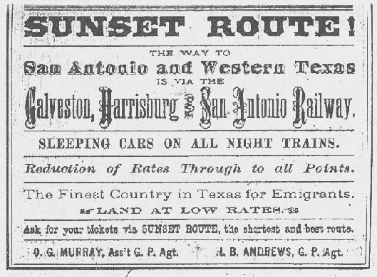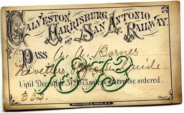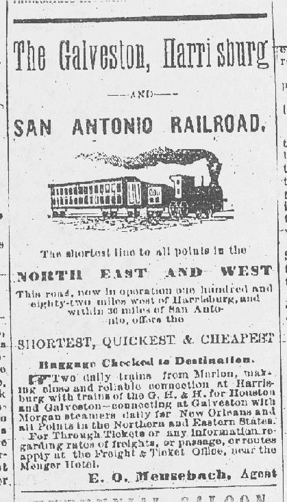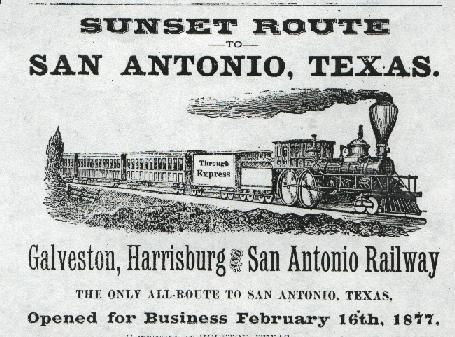 Following the offer of a $500,000 bonus from the city of San Antonio, the BBB&C is renamed Galveston, Harrisburg & San Antonio. Construction of a bridge over the Colorado river at Columbus begins.