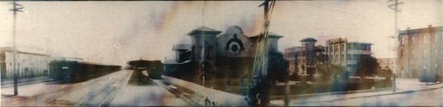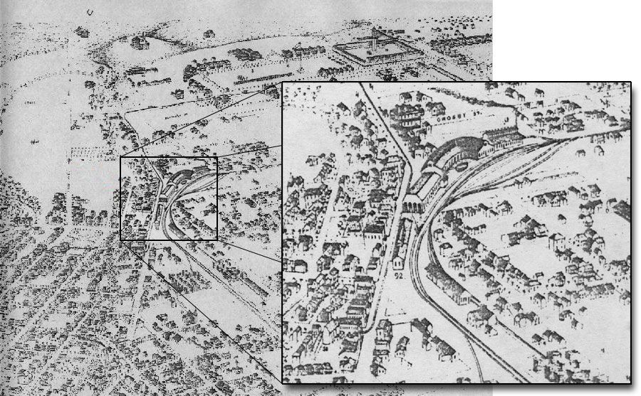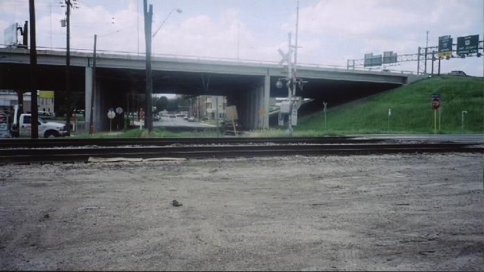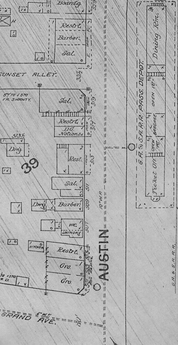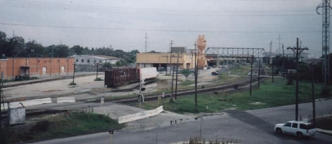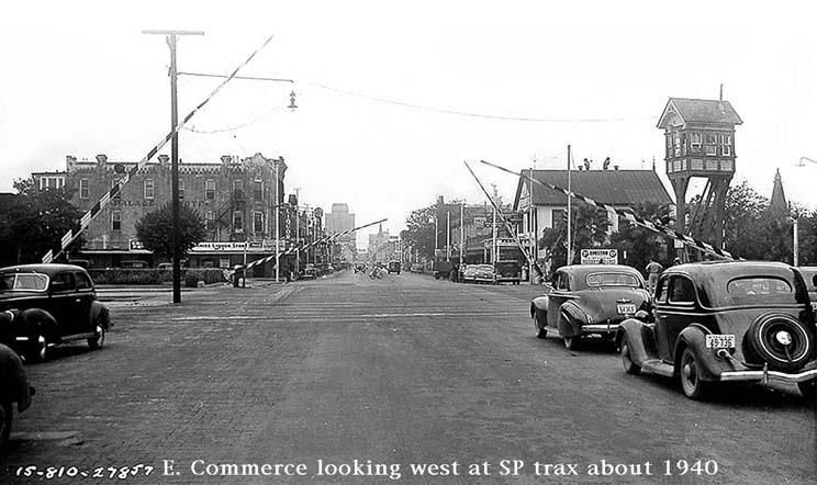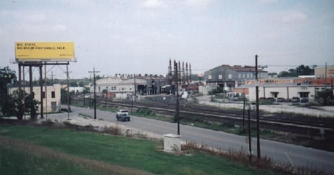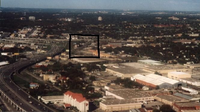 Not wanting to lose their pre-eminent position, the G.H. & S.A. decided to build a newer, grander station. A site was chosen eleven blocks to the south at Commerce Street. Not only was the building larger and infinitely grander, it was also much nearer down town. Most of the businesses that had grown up with and supported the old depot were offered preferential treatment to relocate near Sunset Station and most did. Before long, the old depot was demolished, and the whole area sank back to being just another quiet neighborhood. More tracks at this still sharp bend in the rails were added and the levee strengthened, obliterating any traces of the old depot. In the late 1950's, HWY 281 was built and now on the other side of Austin Street from the rail road tracks is another, even higher, embankment, for the freeway.