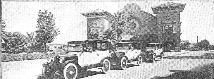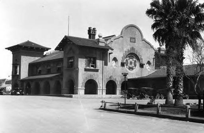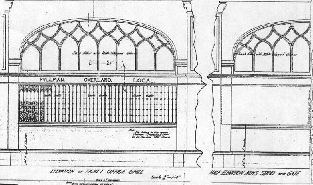 The main building, also known as the head house, had a one story extension that contained the dining room, service room, baggage rooms, plus offices for Wells Fargo, the post office and the Pullman Company. Wells Fargo relocated to an additional building some 70 X 100 feet, built at the south end on the extension in 1909. This building, intended for heavy express freight, was doubled in size sometime between 1931 and 1938. Other than that, alterations and additions to the building have been minimal. A projecting shade canopy was added along the entire extension on the non-track side around 1922. Air conditioning and additional offices were installed around the time AMTRAK took over the building in 1970, as A/C had never been an original feature of the depot. Pictures show a variety of landscaping around the front of the building but there always was a driveway right up to the front door for taxis and other vehicles.