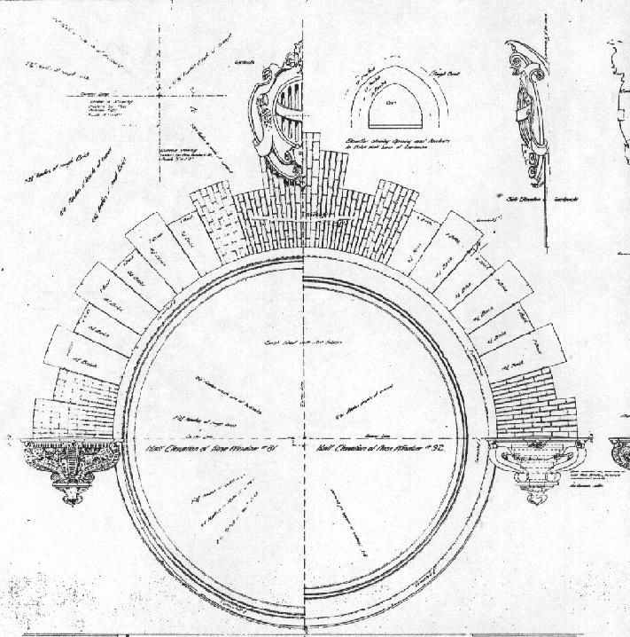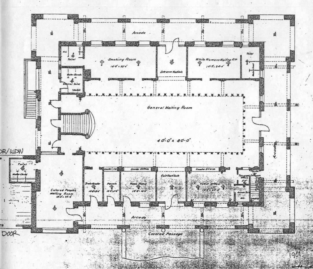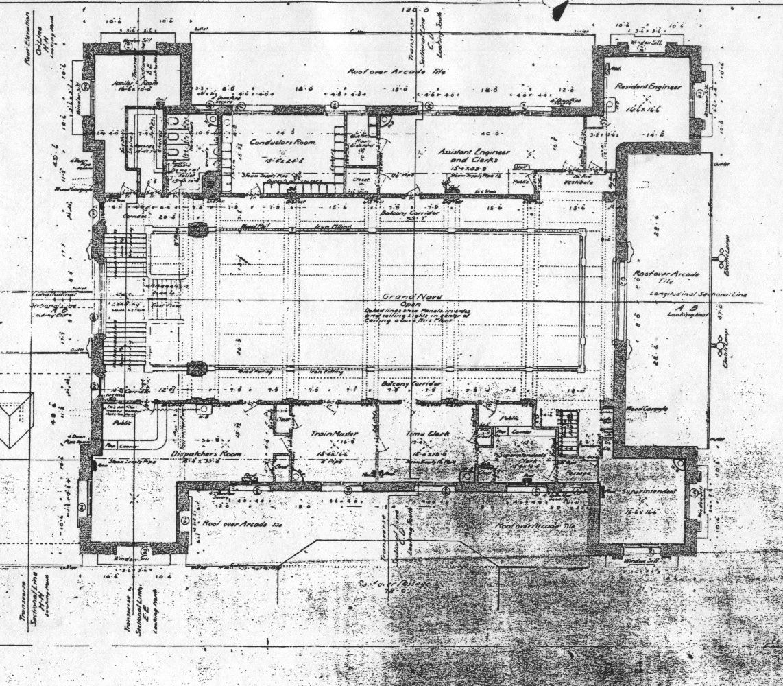 The two story main building contained the general waiting room, a smoking room or men's waiting room, a white women's waiting room, presumably non-smoking, and a colored people's waiting room at the rear with a separate entrance. The colored rest room facilities were enlarged in 1942. Also on the ground floor were trainmaster, ticket and telegraph offices, a parcel window and a newsstand. The main waiting area measures 40 X 80 feet. On the upper floors were offices for the Superintendant, dispatchers, clerks, the resident engineer, draftsmen and conductors. The upper floor could be accessed by the main grand staircase or an ancillary staircase tucked away in one corner. A walkway went around three sides of the upper floor with an ornate railing. The building is made of brick on a concrete foundation, mainly stuccoed except for exposed brick arches and jambs. The roof tiles are of red clay. When it was opened, the building was painted a soft yellow, or ochre, but this was changed to a soft pink somewhere around 1950.
