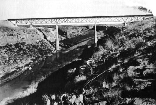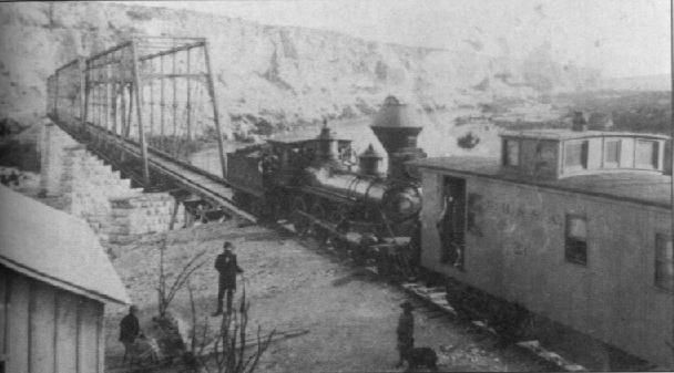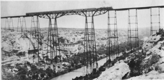 By now Pierce was in sole charge of the G.H. & S.A. The line to San Antonio was already called the Sunset route, although it was often also called the Pierce Line as well. With foresight, he had acquired the rights to continue building west, all the way to El Paso. This was done in collaboration with Collis P. Huntington, of the Southern Pacific, who had been showing interest in the line for several years. The Southern Pacific's goal was very simple. They wanted to build a second transcontinental line to New Orleans, Louisiana, the nearest Atlantic port to the fledgling State of California. It is worthwhile to note that when California became a state, it had no other states around it, only territories, and the Panama Canal was yet a dream. Establishing a more direct route solely under their control would be of enormous benefit to both the S.P. and the whole state of California, and work towards the east through what is now Arizona and New Mexico had already begun by 1880, when the G.H. & S.A. began to survey a route to El Paso. Although work had hardly begun west of San Antonio on what was being called the Sunset Extension, the S.P., building eastward from California, had already reached El Paso by May of 1881. Lacking permission to continue working towards San Antonio, the same crews continued on across Texas, with the simple expedient that they were now employees of the G.H. & S.A. In case you had forgotten just how big Texas is, the crews working from both directions did not meet up until January, 1883, at a point just west of the Pecos river, some 225 miles west of San Antonio. Pierce drove home a ceremonial spike on January 12, 1883. The route would be shortened and the original Pecos bridge replaced, creating the highest rail bridge in the USA. Sections of the old route, that involved descending much further to cross the river, are well marked within a state park near the river.