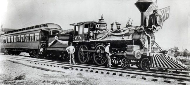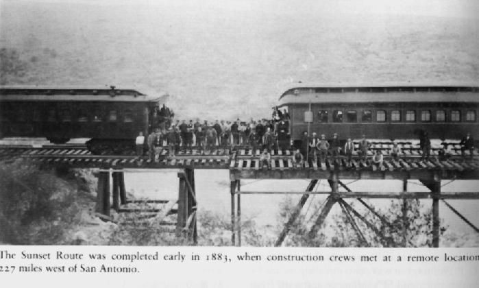 GH&SA tracks meet SP tracks built from California 225 miles west of Texas near the Pecos river creating the nation's 2nd transcontinental service, the only one totally under the control of one company. 1st passenger and freight trains arrive from San Francisco.