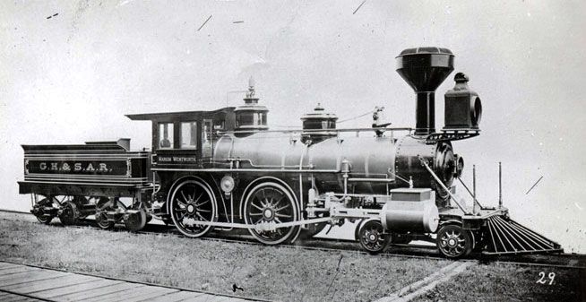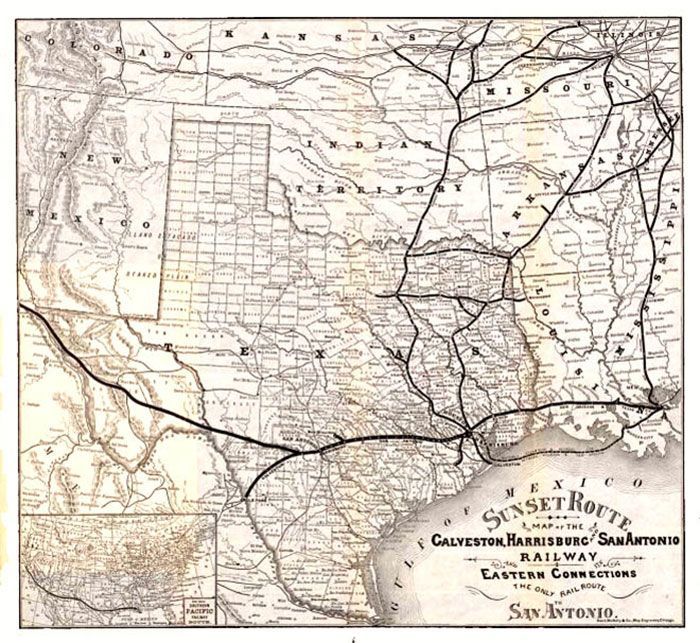 The Galveston, Harrisburg and San Antonio Railroad, the first railroad to arrive in San Antonio, has a wonderful pedigree and history all of its own. It is also prudent to mention even here its association with the Southern Pacific is almost as old as the company itself. The G.H. & S.A. began, logically enough, in Galveston, which was then the largest city in Texas and which was keen to see its port facilities grow. Connecting to the rest of the world via rail was the only expedient way to go in the 1850's and any number of railroad companies were formed, many of which were very successful. You would have difficulty finding Harrisburg on a modern map today, but the Harris name lives on as the name of the county, while the city itself was absorbed by Houston and is now just one of it's many districts. In 1870, the G.H. & S.A. arose like a phoenix from the post civil war ashes of the Buffalo Bayou, Brazos and Colorado Railway Company which was chartered in 1850 and was the first railroad to operate in Texas. The BBBC was founded by General Sidney Sherman, who is credited with coining the phrase, "Remember the Alamo!" at the battle of San Jacinto. The first locomotive owned by the BBBC was named, "The General Sherman." If you cannot find the Buffalo Bayou on a modern map, look instead for the Houston Ship Canal, which is what it was developed into. In 1870, Thomas W. Pierce gained control and the company was renamed. While other railroads were setting off for Louisiana, Dallas and Austin, the G.H. & S.A. set its sights on San Antonio.