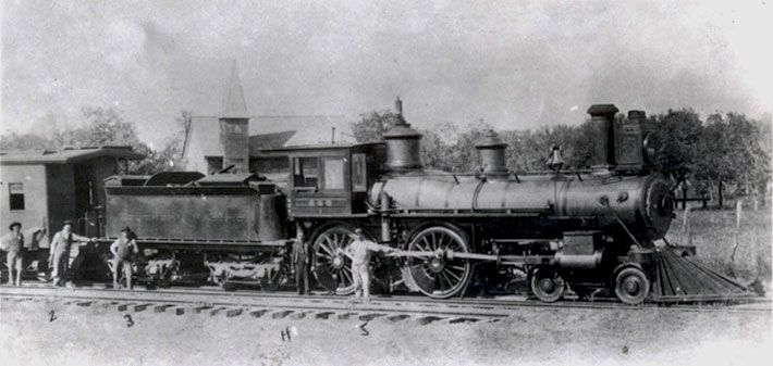 New construction from Columbus, 125 miles east of San Antonio, which the railroad had already reached via its own construction and the acquisition of other railroads, began in 1873, under the leadership of Major James Converse, after whom one of the towns that would spring up along the way would be named when he acquired land there for himself. Stops along the route from Houston were Pierce Junction, after 8 miles, Stafford, another 20 miles, Walker, 5 miles on, then Richmond, 6 miles, Random, 10 miles, East Bernard, 10 miles, New Philadelphia, 16 miles, Eagle Lake, 8 miles, Alleyton, 12 miles, to Columbus, another 4 miles. Progress continued to Borden, 10 miles, Weimar, 6 miles, Schulenburg, 9 miles, which was reached by the summer of 1874. Then onto Flatonia, 12 more miles, Waelder, 13 miles, Harwood, 13 miles, Luling, 9 miles, and Kinsbury, another 12 miles, which was reached by the summer of 1875. Then onto Seguin, 9 more miles, Marion, 7 miles, by the spring of 1876. Then onto Converse, whose second depot is now located at the museum, another 18 miles, then Upson, another 8 miles and finally, on February 5, 1877, San Antonio, another 5 miles on.