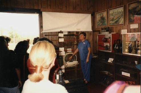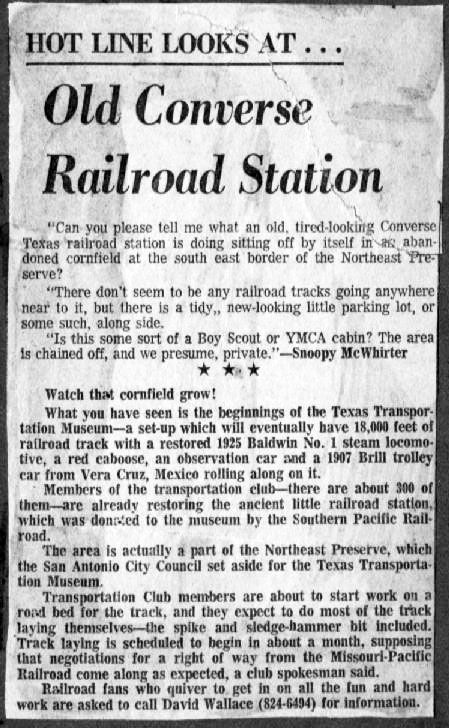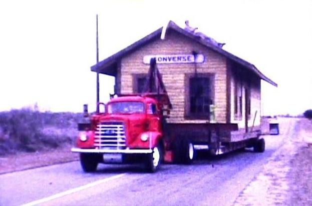 The depot was not in particularly good shape when it came to the museum. Founding museum member, Dave Wallace, Charter Member #1 and first chairman of the museum, saw the neglected old structure while driving through Converse in 1968. He made some enquiries and found out it was soon to be demolished. Dave, was, and still is, an enterprising kind of fellow, so he made his way to the office of the Southern Pacific District Superintendent. He asked if the SP might donate the building to the museum and was given a swift affirmative. He was told if the museum could get to it before the soon to arrive SP wrecking crew to go ahead and take it. If the crew got there first, however, they would not hang around to see if we might be able to make something happen. Wasting no time, Dave had a friend who owed him a favor go out to Converse and, before the good folks of Converse knew what had happened, the whole building was lifted up and carried away to its new home. With the passage of time, it has now spent far more time at the museum than it did in Converse !