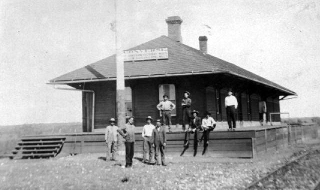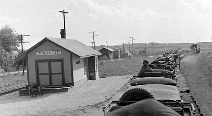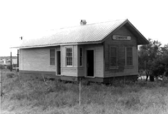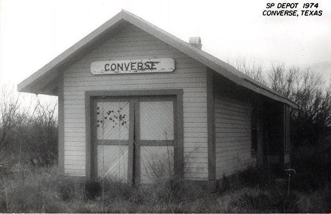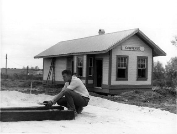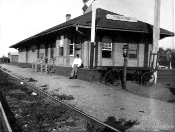 Above are two pictures of the second, much larger, depot in Converse. It was built around 1900 to replace a smaller structure built in 1878. It had housing quarters for the migrant labor used to harvest one of the area's main crops back then, cotton. The railroad brought the labor in, housed them and shipped the cotton out. Adjacent to the depot was a huge cotton mill at one time. The building was raised with a ramp at one end to facilitate the loading of cattle on to trains. The station master from 1919 until the 1940's was a German immigrant, Philip Antes, who can be seen in the second picture. He liked Converse because so much of his native German was spoken there, but he was able to become fluent in both spoken and written English and Spanish, with the help of his wife, Lillie Bolton. Mr. Antes was a fine agent for the 'friendly railroad,' encouraging several businesses to locate in the area. Regrettably, he suffered a bad fall while inspecting a box car which led, eventually, to the amputation of the affected leg. It took time and perseverance but, fitted with an artificial leg, he did return to work some eight months after his accident. This structure was torn down and replaced in 1940. The building was old, and mostly unused by the time it was replaced, and new bulk shipping methods rendered local operations obsolete. To avoid paying higher taxes, the railroad made a point of not including a restroom or even ruining water in the replacement depot but may have used some of the old building's material, such as the bay window.