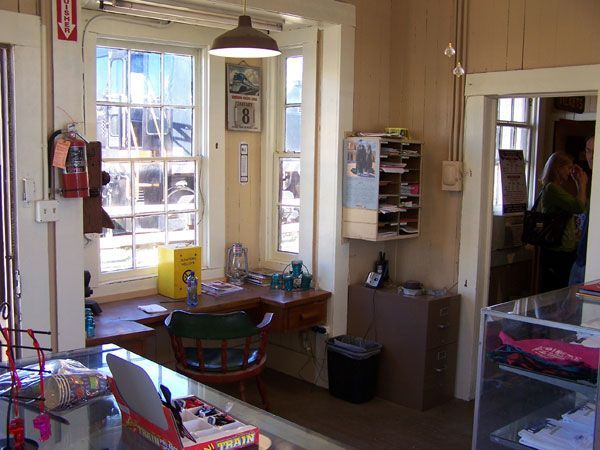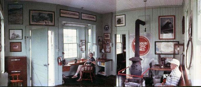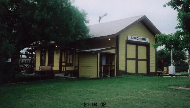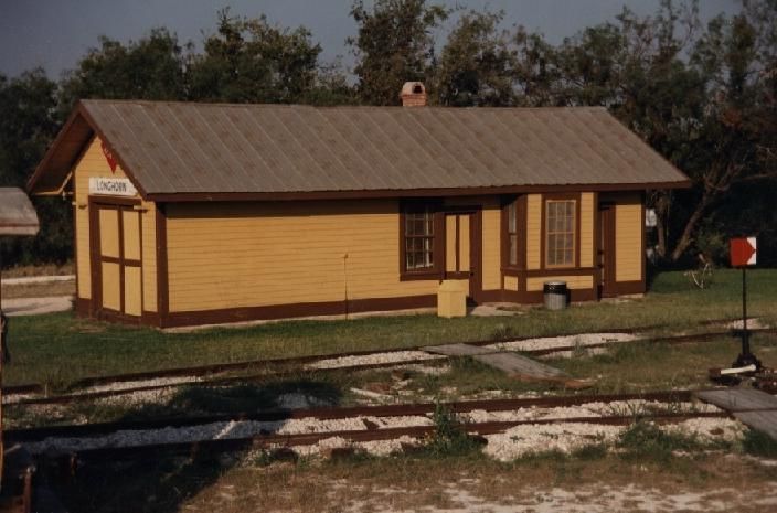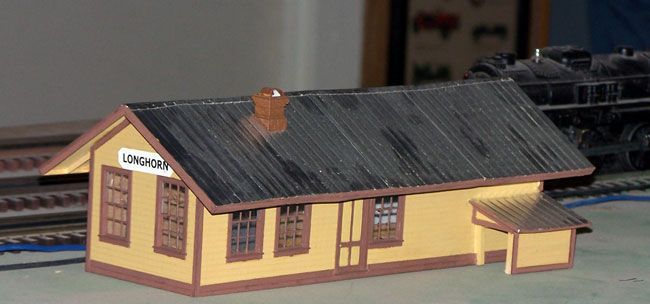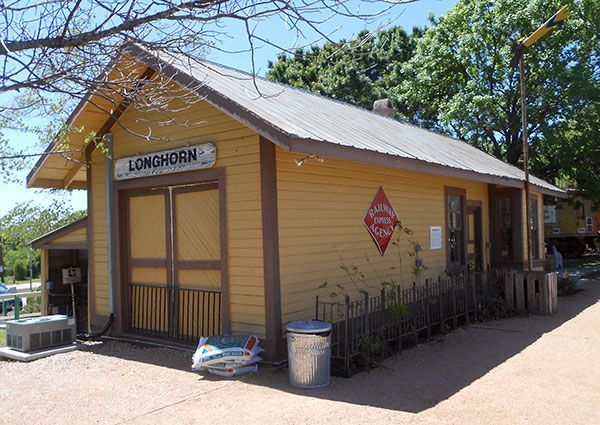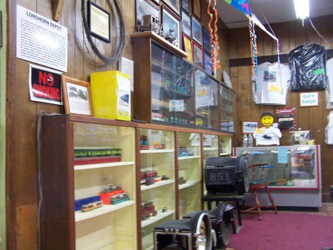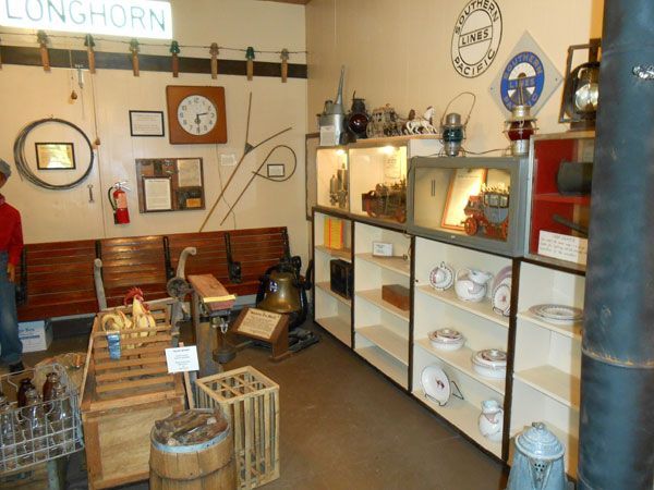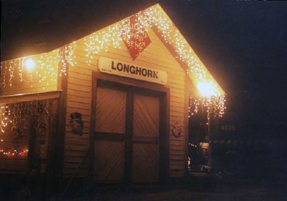 Our depot is very typical of small town depots which used to dot the mainlines all over Texas. It has two main rooms. One, with windows and the stove, was for passengers. The other was the freight room. Our depot and our railroad took their names from the adjacent Longhorn junction on the Union pacific mainline opposite our front gates, which serves a nearby rock quarry.