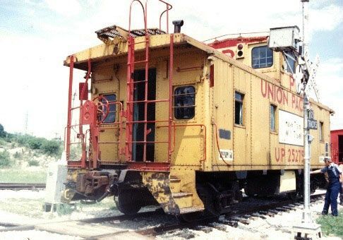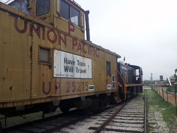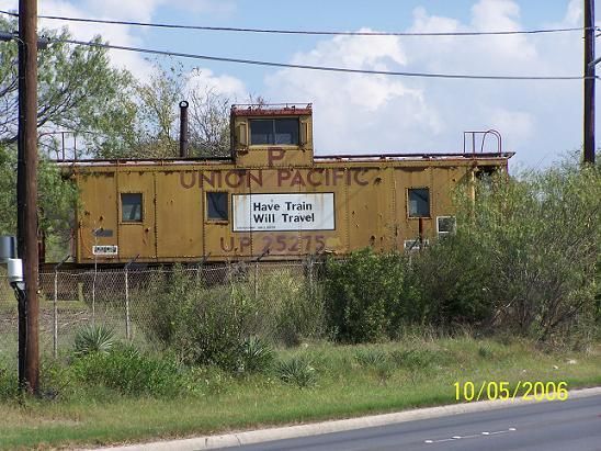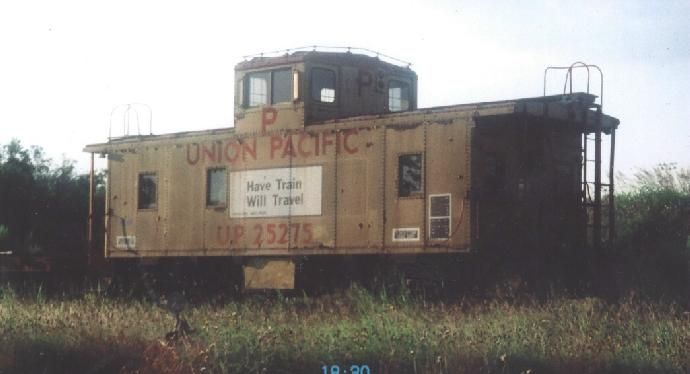 Union Pacific caboose 25275 is a road caboose. It is large to accomodate the conductor and other train personnel in relative comfort over long distances. It has a central cupola for a superior, unobstructed, view of the train and the tracks. It still has its original desk and storage areas for maps and other documents. It has bunks for sleeping, a stove for heat and cooking, and a commode. It has an old UP advertising slogan on the side. "Have Train. Will Travel."